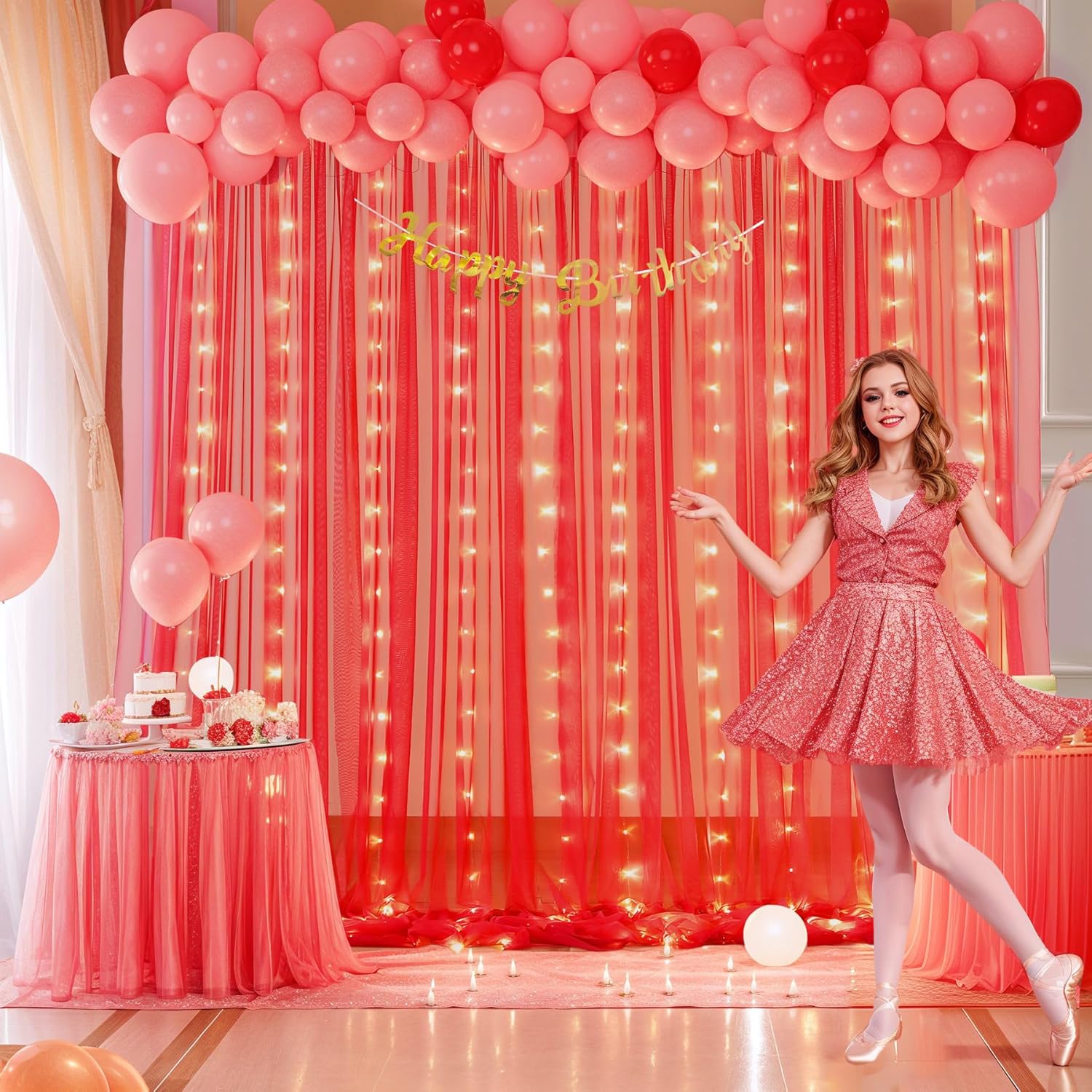 - Red sheer backdrop curtains with lights wide range of use : Perfect for wedding backdrops for reception, wedding ceremony, photo booth, baby shower, birthday party, gender reveal, bridal shower, engagement, photography backdrop, photoshoot, graduation, home room decorations, candy buffets, dessert tables background, holiday party, Christmas backdrop curtain decorations or anywhere you want.