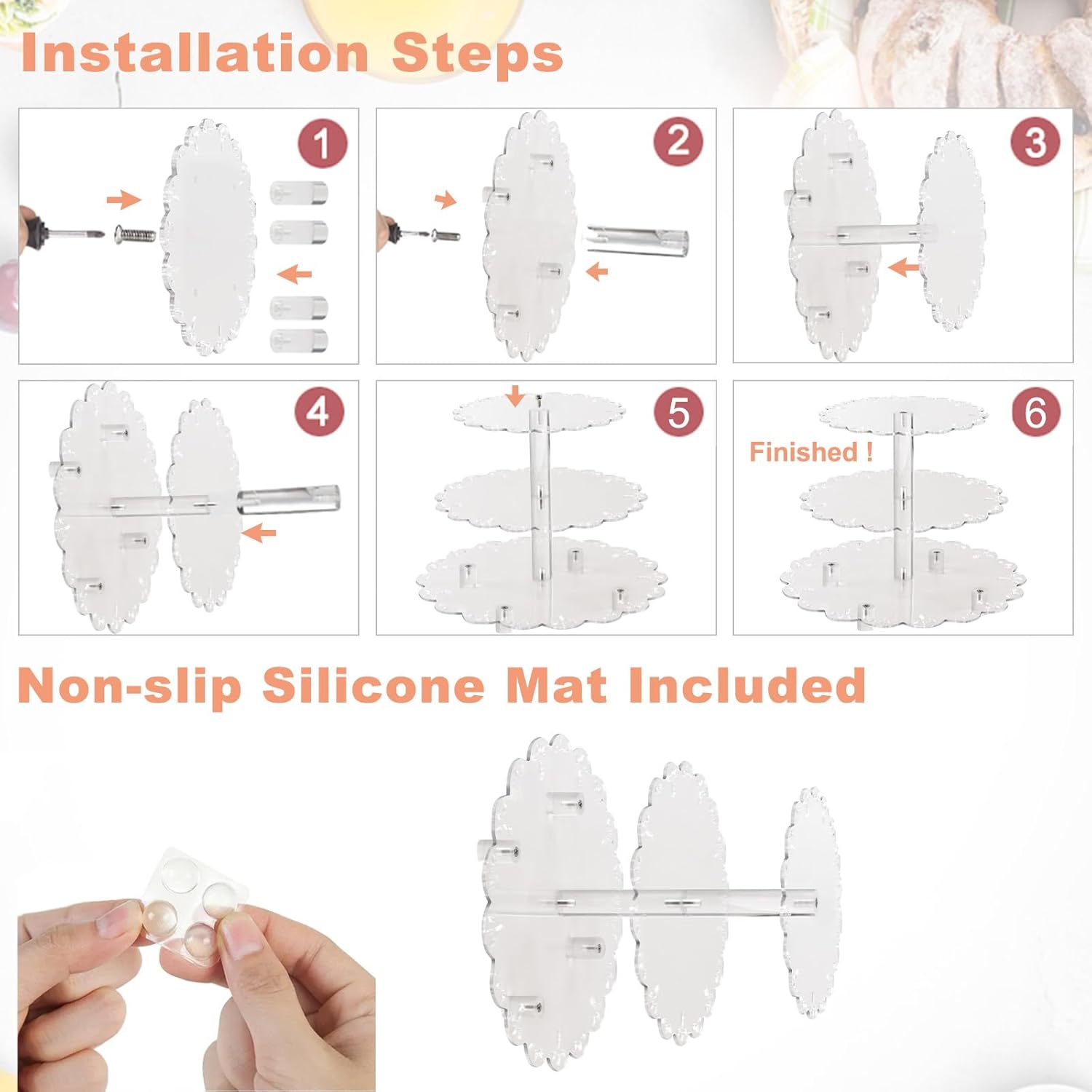 - 【DIY Macaroon Cupcake Holder】The 3-tier cupcake display stand can easily install one by one from big to small. Connect the acrylic rod and plate with screws and tighten all the parts, quick and easy to make a special dessert plates for your party. 4 anti-slip stickers are added to the base to keep the bracket stable