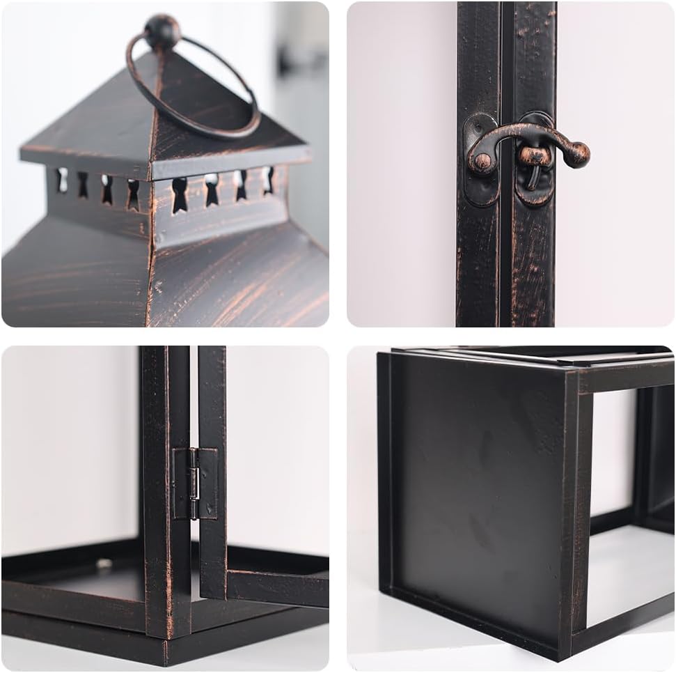 - Inspired Design with LED Candles——The combination of multiple sets adds a variety of possibilities to your home decor. The antique metal paint design combined with black and gold colors make them the perfect addition to the porch, patio and garden. You can easily place the lantern anywhere you want through lifting the top pull ring.