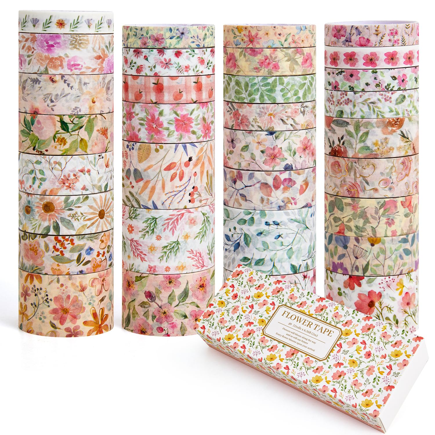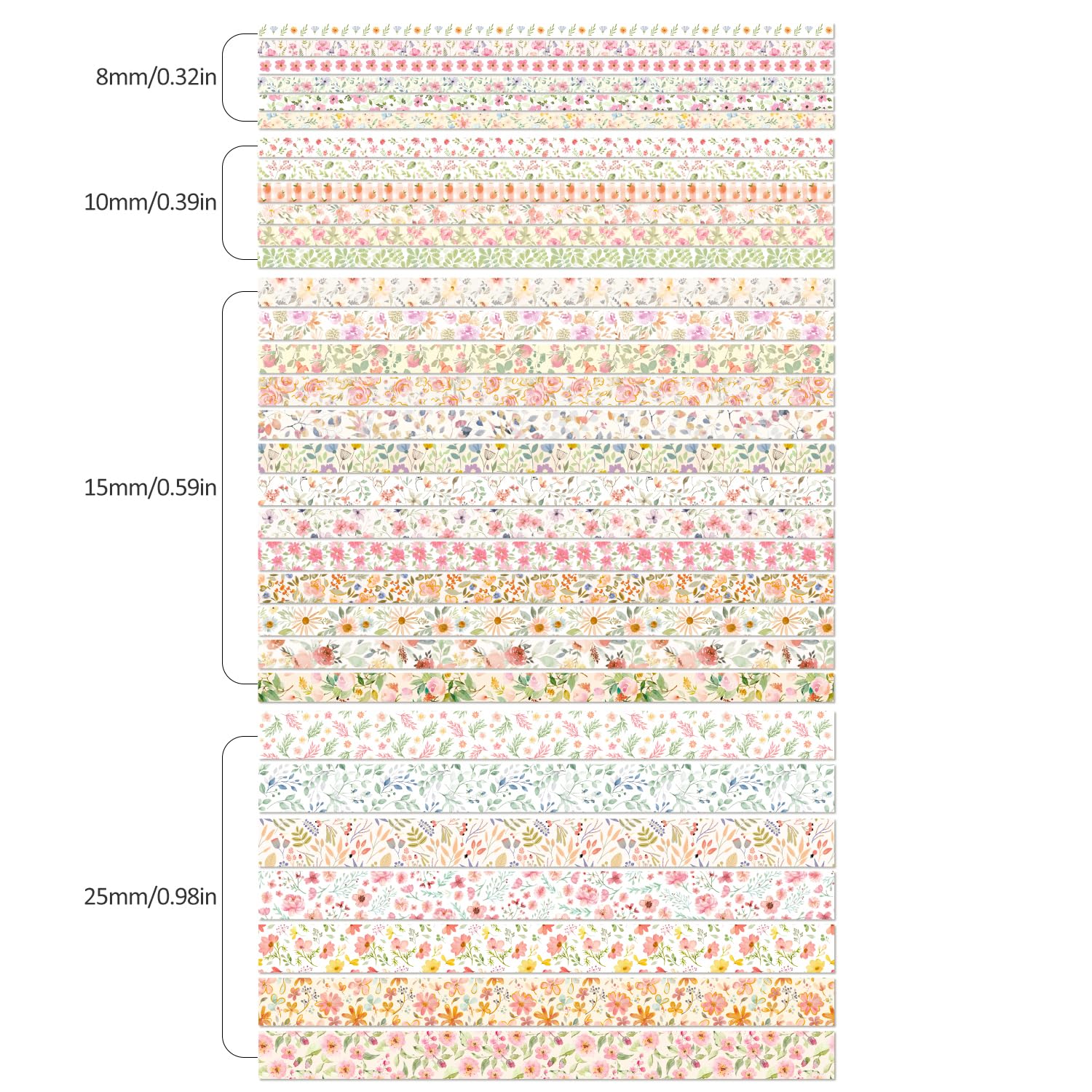 - [32 Rolls floral designs] 32 Rolls Washi Tape, 0.31 inch(8mm)wide x 6 Rolls, 0.39 inch(10mm) x 6 Rolls, 0.59 inch(15mm)wide x 13 Rolls, 0.98 inch(25mm) x 7 Rolls, each roll is 2m.32 different patterns, this oil painting washi tape adds color and vitality to the pasted items, making daily life more interesting.