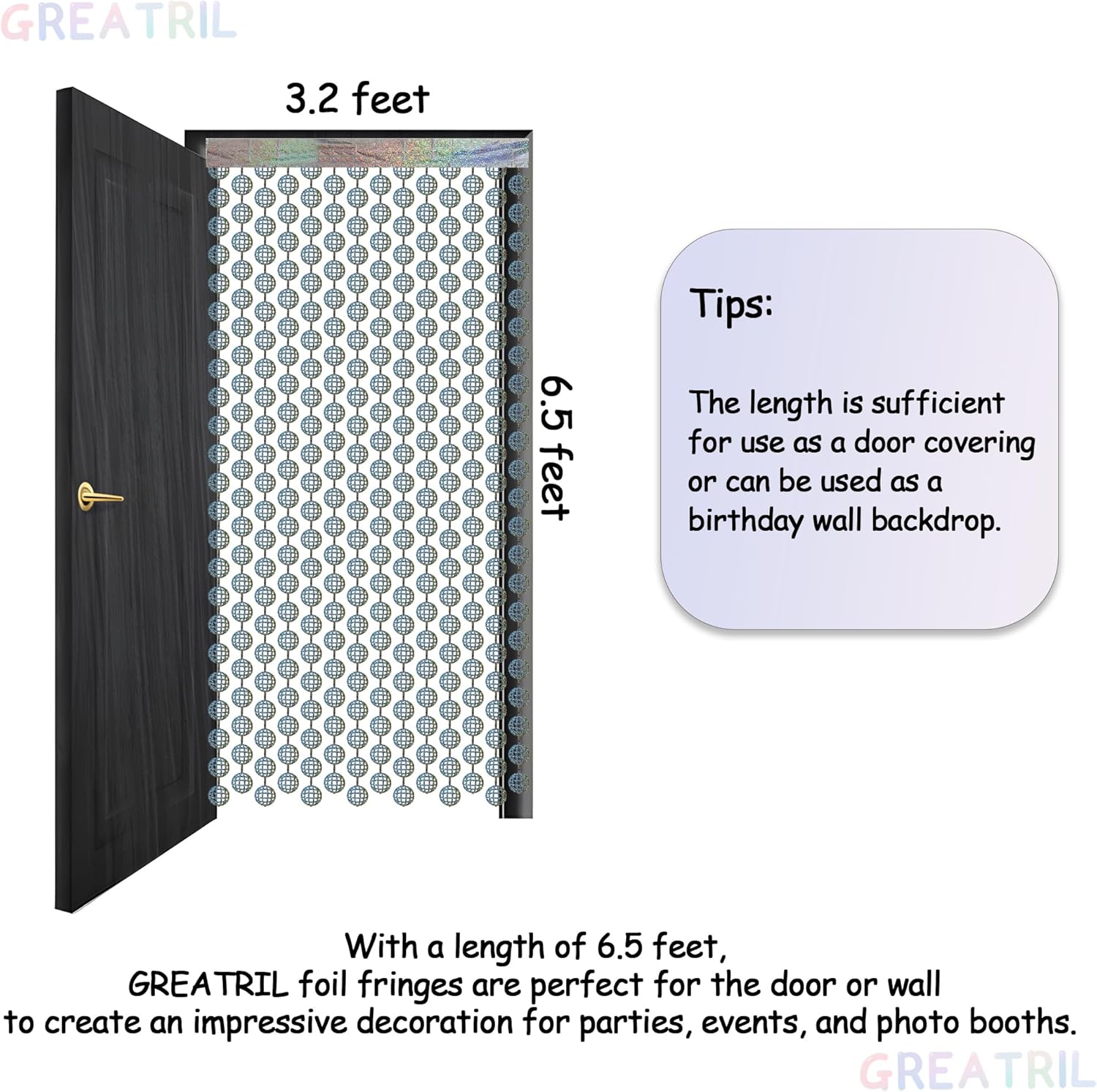 - Each backdrop measures 3.2 feet by 6.5 feet, and the set includes 2 packs. This size is ideal for decorating walls or doors, offering substantial coverage to enhance your party space with a dramatic, shimmering effect.
