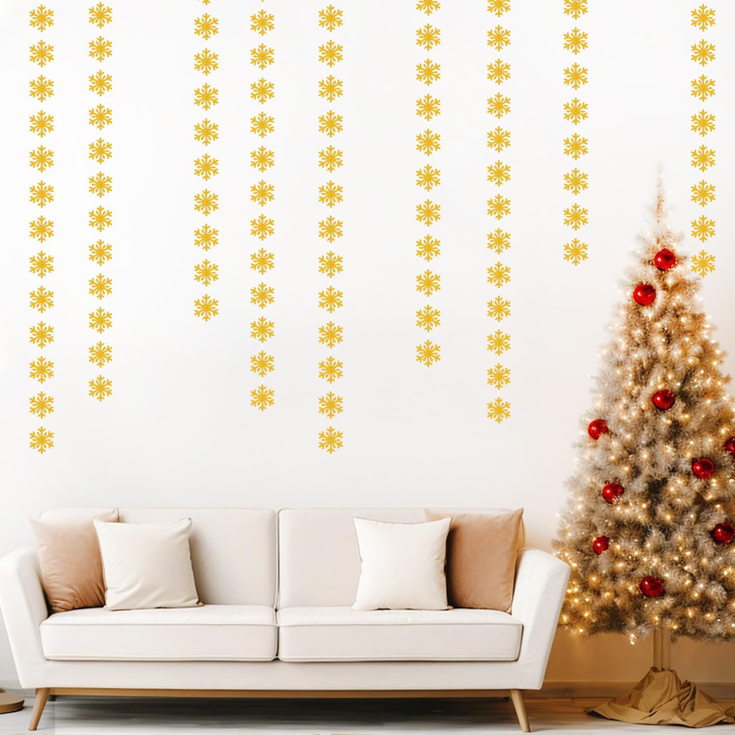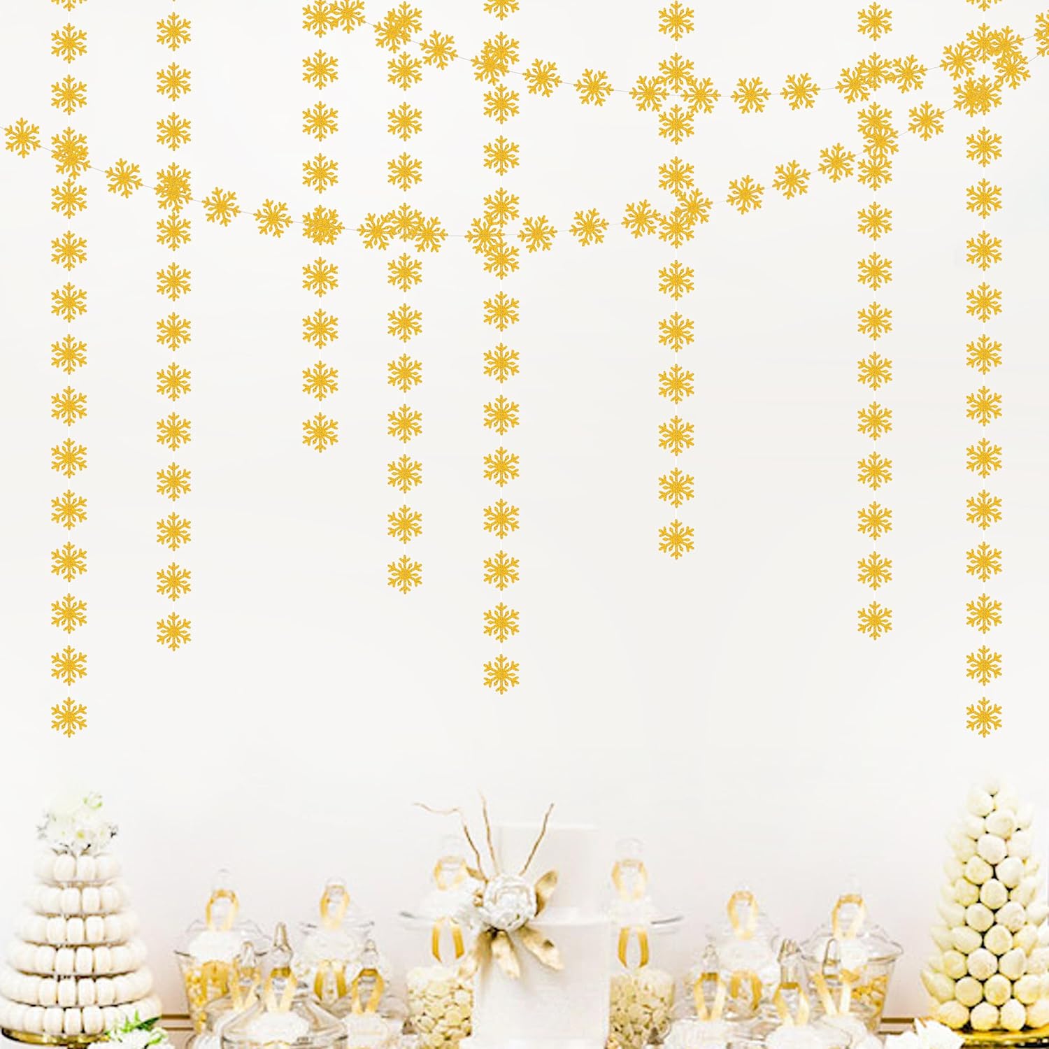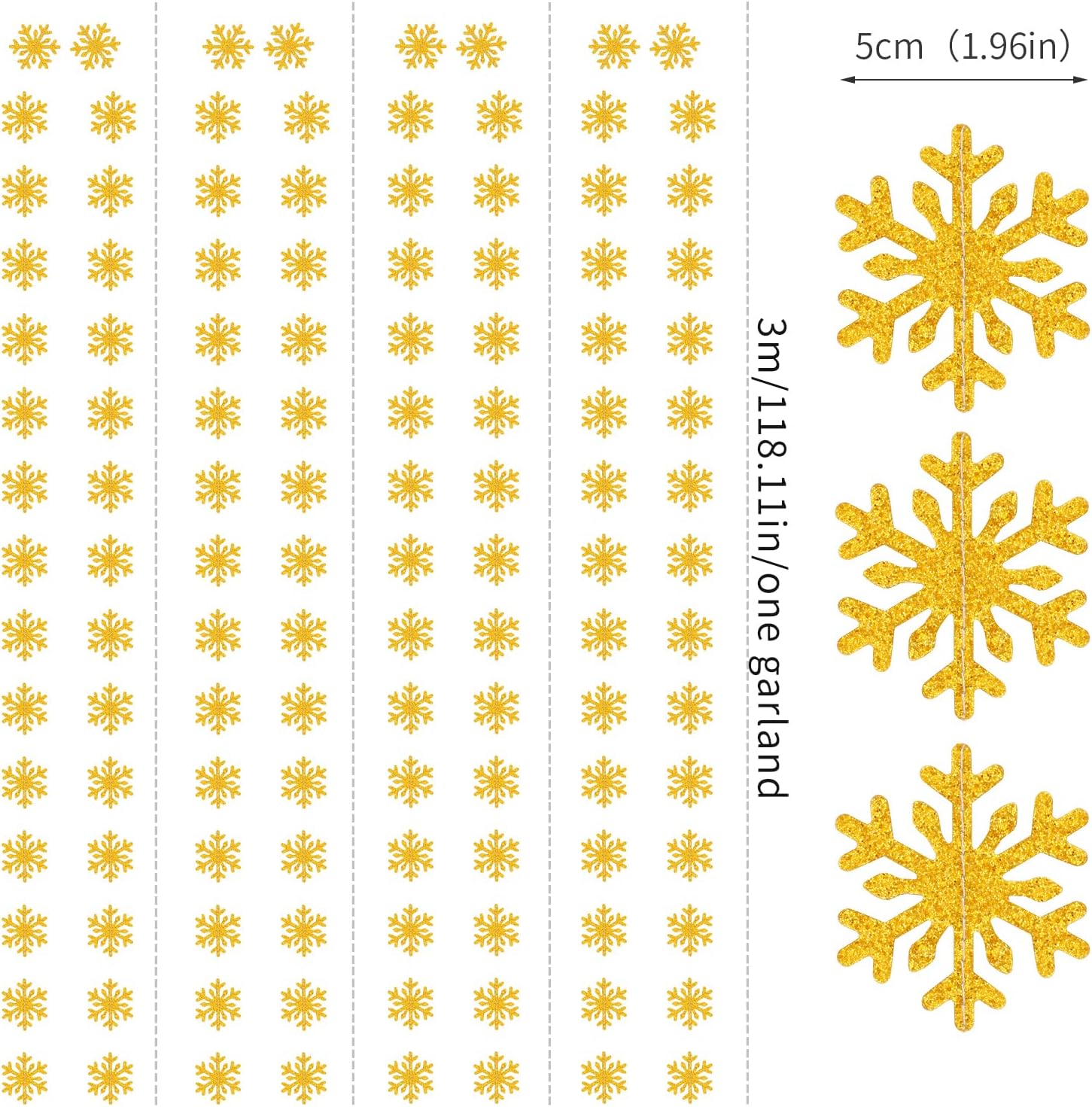 - 【Snowflake Gold Christmas Decorations Kit Includes】The party garlands includes 4pcs paper garlands, each backdrop bunting is 13 feet/ 4 meters long, total length is 52 feet/16 meters.