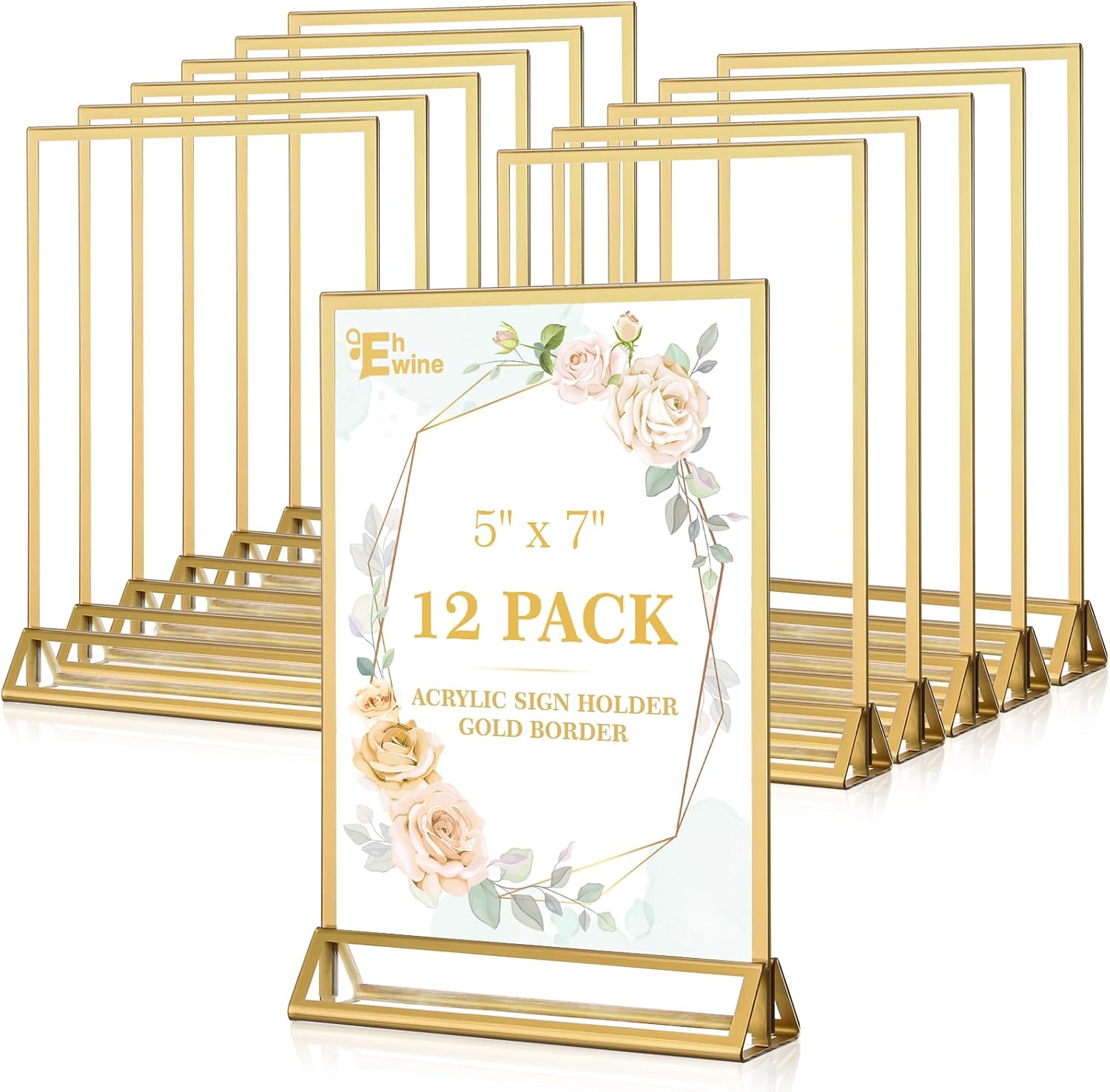 EHWINE 12 Pack Acrylic Sign Holder 5 x 7, Double Sided Gold Picture Frame Stand up Table Top Sign Holders, Clear Display Stand Menu Flyer Holder for Wedding Party (Provide Non-slip Mats)