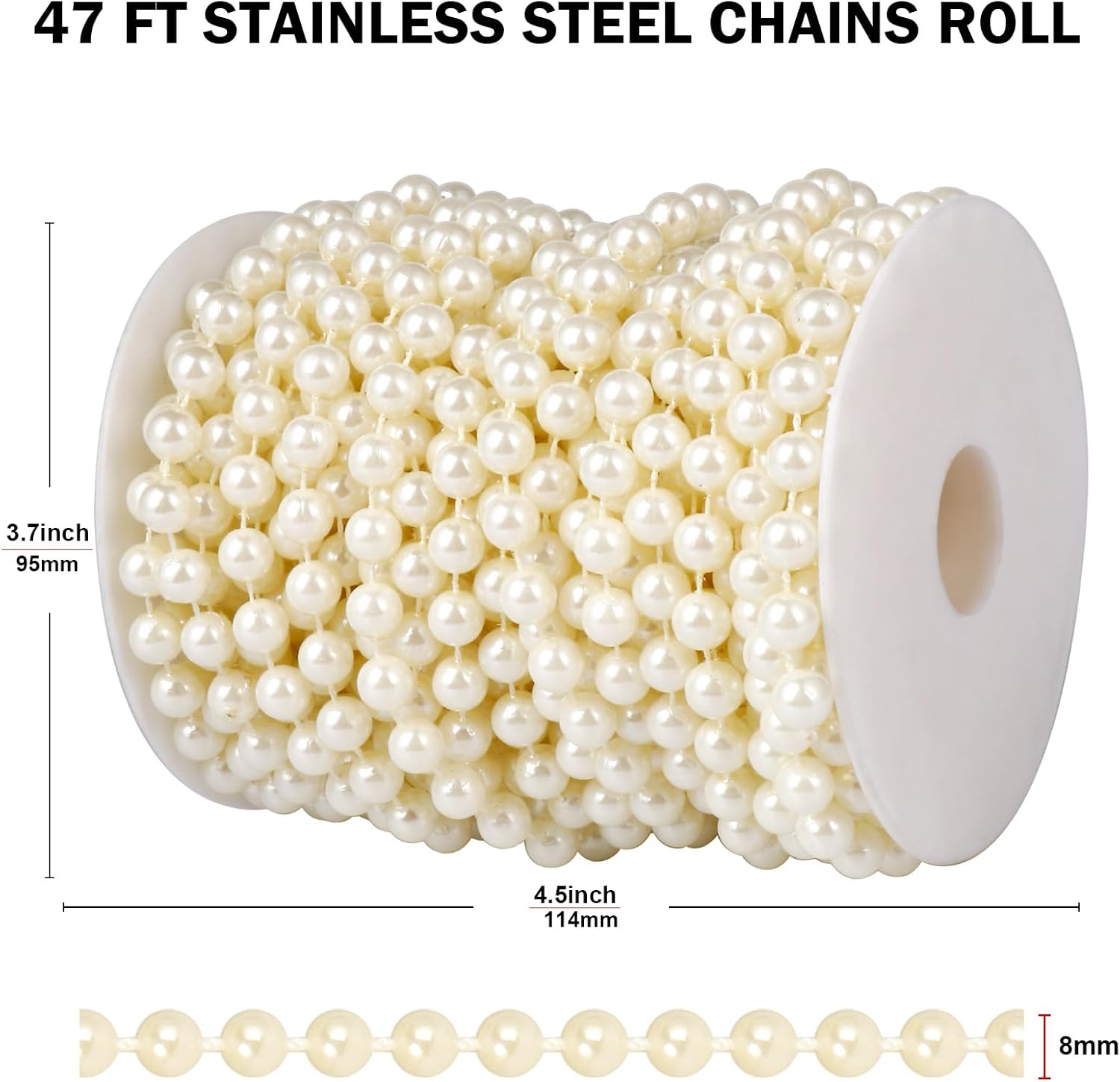 47 FT Pearl Beads Garland for Decoration, 8MM Craft Pearl Beads String Spool Ivory Color Faux Pearl Strand Roll for DIY Craft Wedding Party Christmas Tree Decoration
