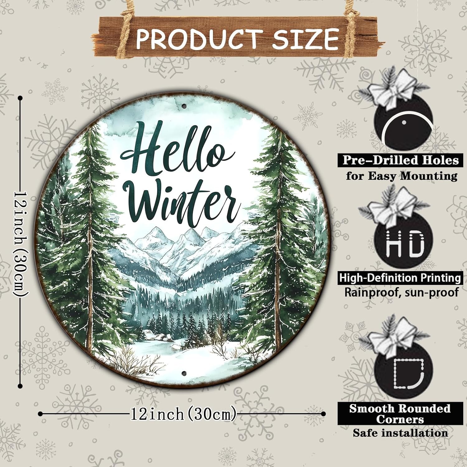 Round Christmas Metal Tin Sign Hello Winter Sign Christmas Pine Trees Welcome Door Sign Xmas Winter Holiday Farmhouse Rustic Wreath Sign for Indoor Outdoor Home Wall Window Decor 12*12 in