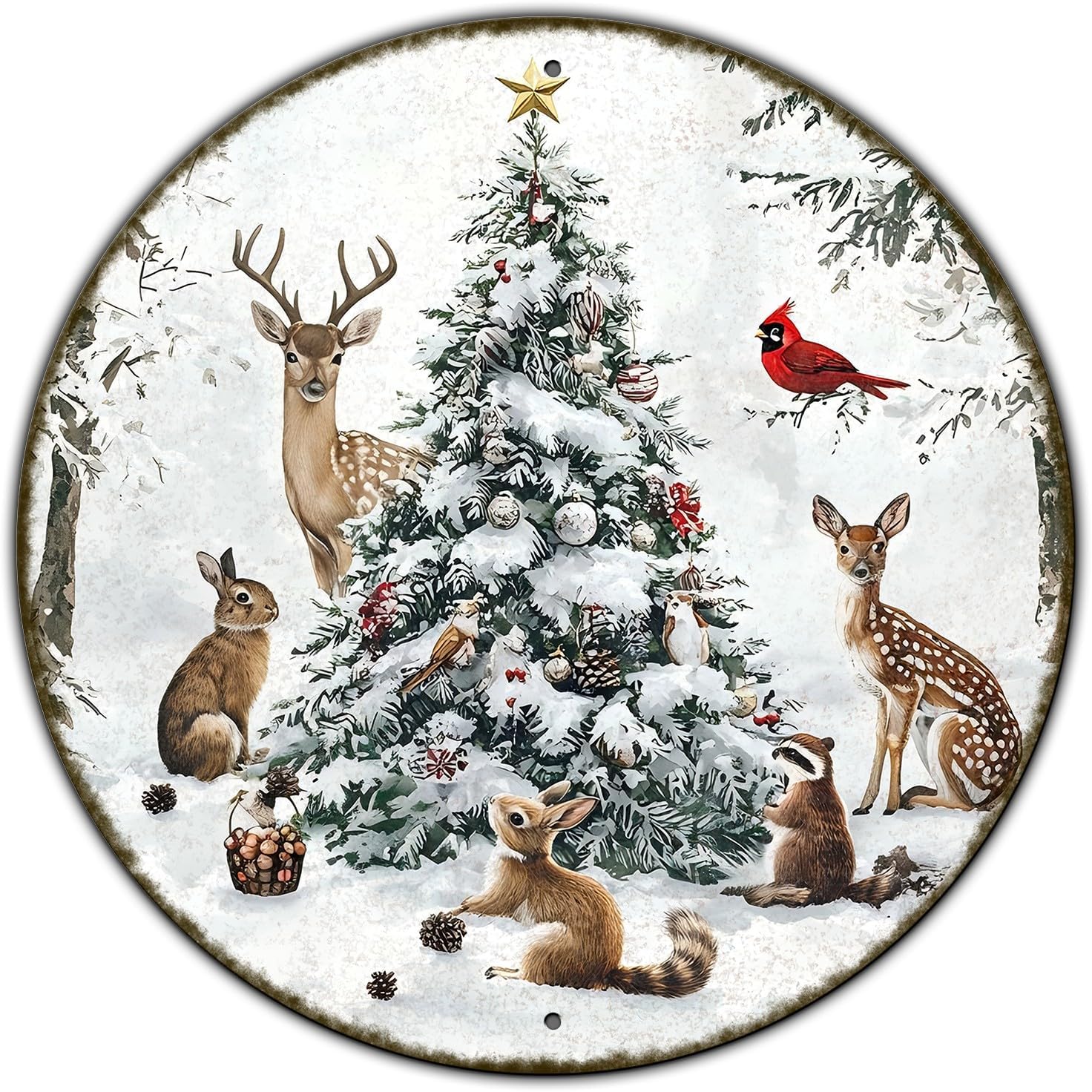 Round Christmas Snow Animals Metal Tin Sign - Vintage Christmas Tree & Winter Sign for Home & Outdoor Decorations - 12 * 12 in
