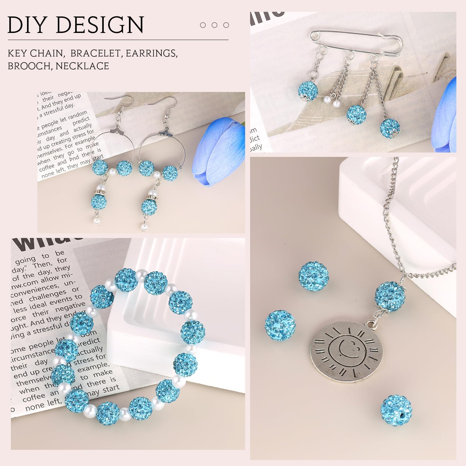 200pcs 10mm Aquamarine Rhinestone Beads for Jewelry Making, Shiny Round Shamballa Disco Ball Beads Bulk, Sparkle Crystal Clay Christmas for Bracelet Baseball Necklace Earring Crafting and DIY