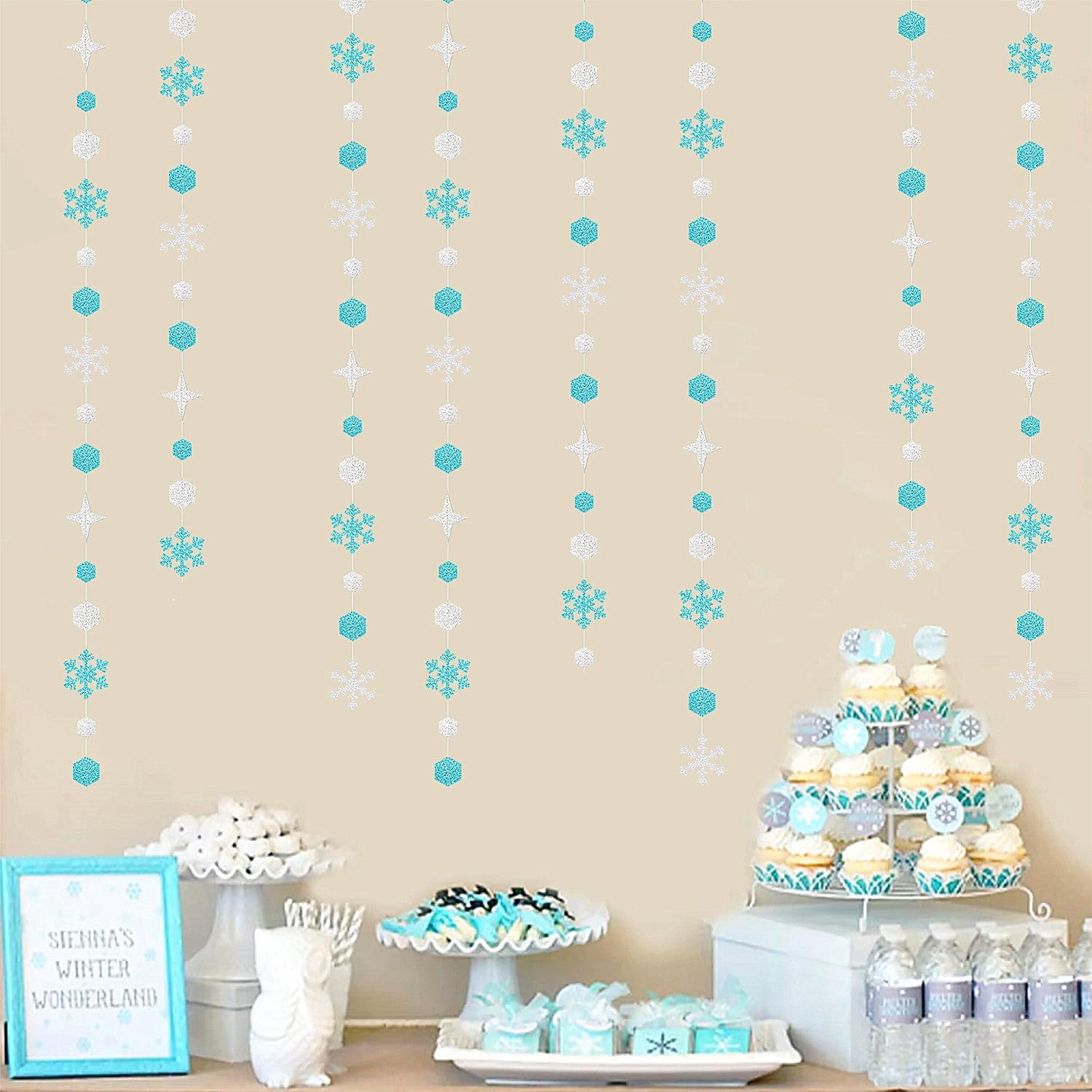 - PACKAGE CONTAINS: This set has four teal silver snowflake paper garland,the length of each strand is 4 meters/13 feet, the total length is 16 meters/52 feet.The snowflake size 2.8IN,quadrangle size2.8IN,hexagon size1.6IN and 1.2IN.