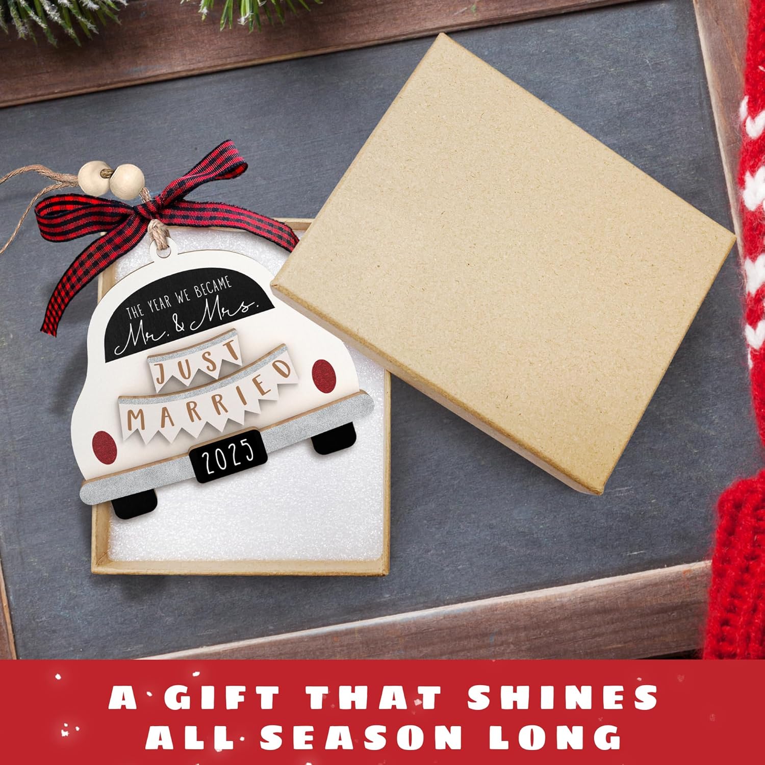 - ORNAMENT SET INCLUDES: You will receive 1x One-sided Ornament, 1x Twine Rope Ribbon, and 1x Kraft Gift Box. This twine rope also features two wooden beads and a caro red ribbon. The included instruction sheet will show step-by-step how to tie the rope with your ornament. By following these instructions, you'll able to create a unique and rustic look for your Christmas tree.