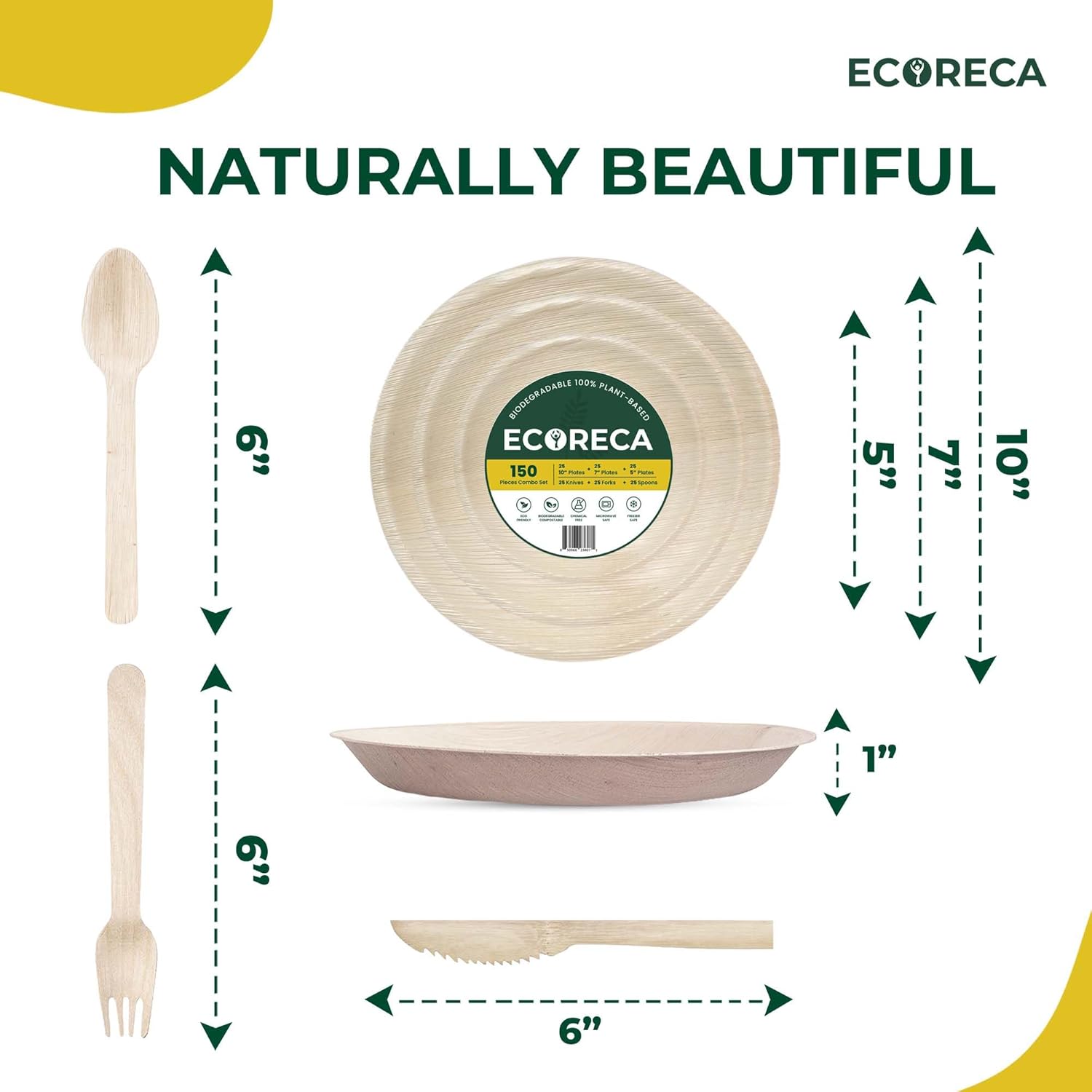 150-Piece Biodegradable Palm Leaf Dinnerware Set | 10", 7", 5” Inch Round Plates |Eco-Friendly Disposable Plates & Cutlery for 25 Guests Forks, Knives & Spoons for Wedding, Parties, BBQ