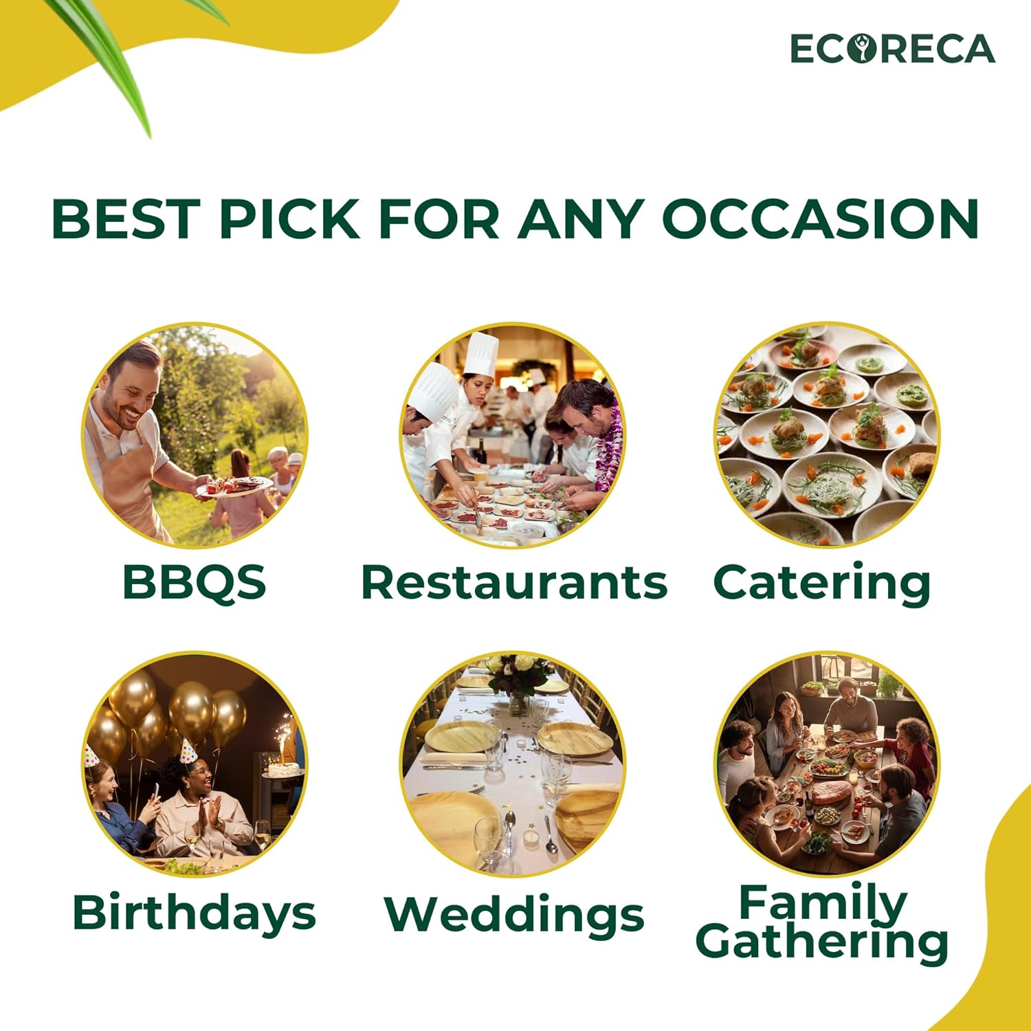 - [Bulk Packaging for Convenience] – Each pack includes 150-piece palm leaf dinnerware Set, ensuring you have ample supplies for large gatherings while minimizing the need for frequent restocking. Perfect for weddings, parties, and catering events.