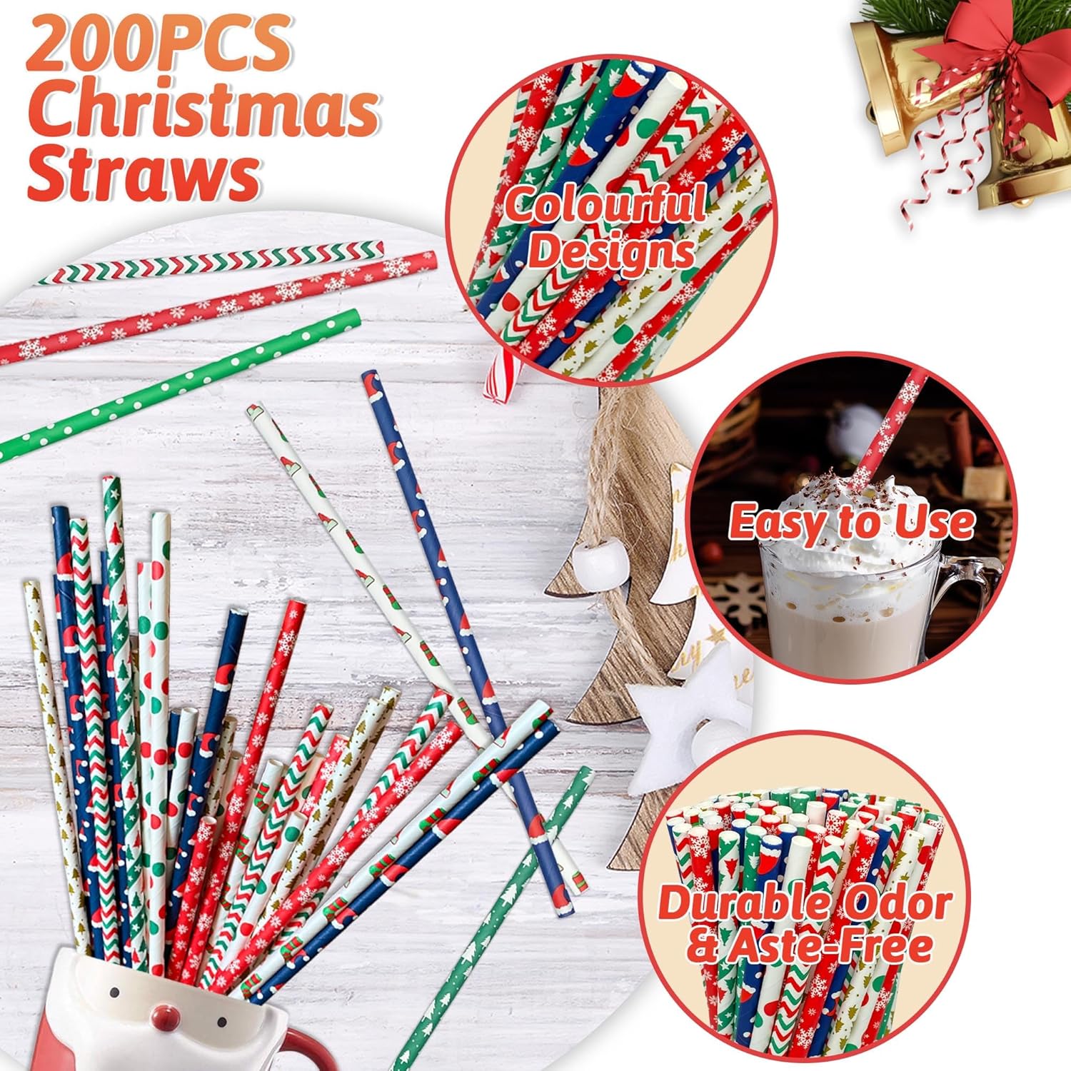 200 Pcs Christmas Paper Straws, 10 Styles Biodegradable Colorful Disposable Drinking Christmas Straws for Christmas Party Supplies, Desserts, Thanksgiving, New Year and Holiday Party Decorations