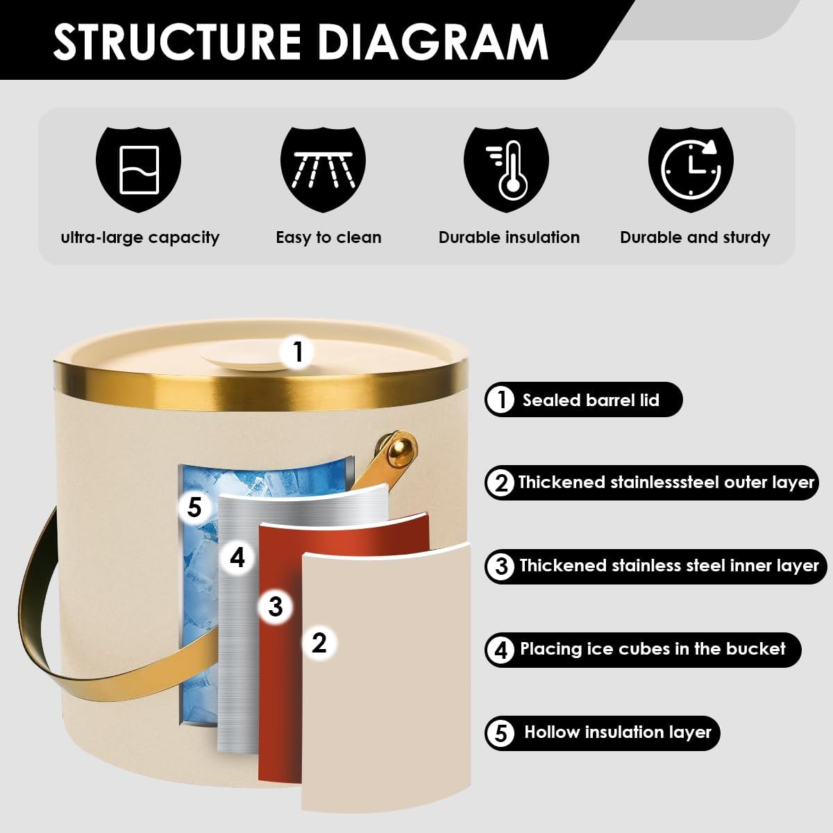 - 1.3-liter extra-large capacity insulated thickened stainless steel ice bucket, capable of holding more beverages. With a wide-mouth design, it's easy to grab and place items, making it perfect for parties.