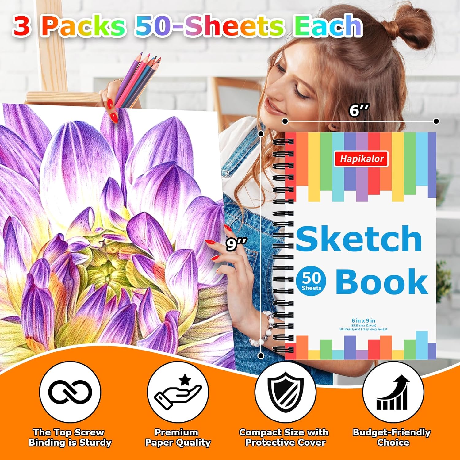 Hapikalor Drawing Pad for Kids, Sketch Pads 50 Sheets, 3-Pack Kids Travel Activities Spiral Bound Drawing Books Bulk 6" x 9 ", Drawing Paper for Kids 9-12