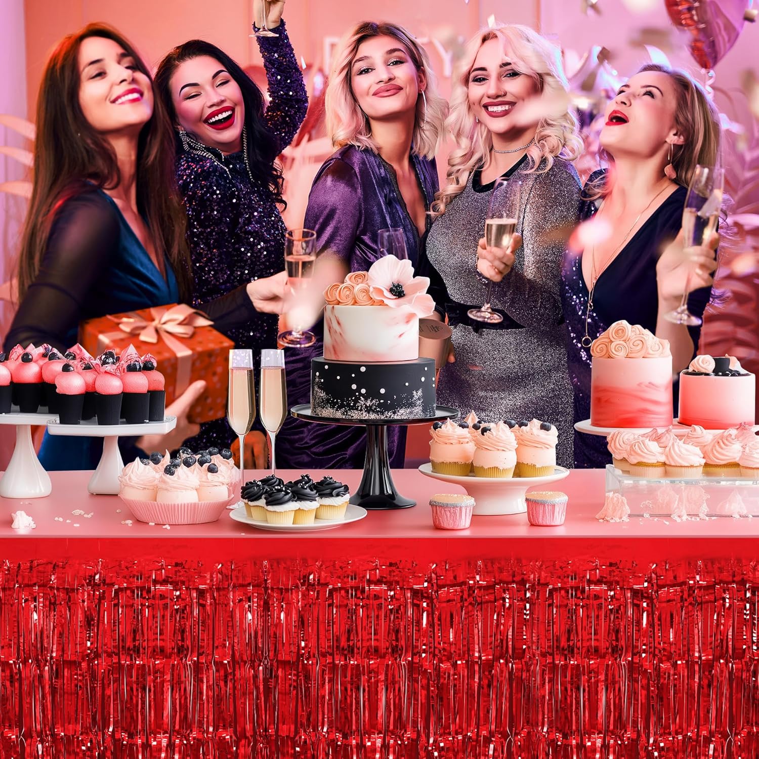 2 Pack Red Table Skirts, 29x108" Metallic Foil Tinsel Fringe Table Skirts for Rectangle Tables Streamer Curtains Backdrop, Party Decorations for Birthdays Weddings Holidays