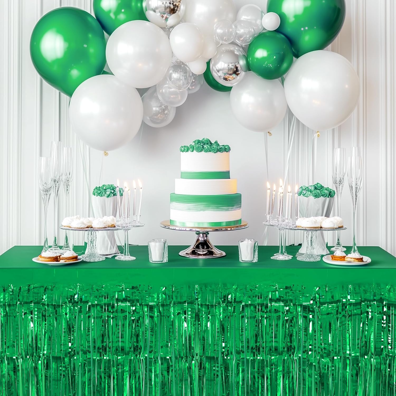 2 Pack Green Table Skirts, 29x108" Metallic Foil Tinsel Fringe Table Skirts for Rectangle Tables Streamer Curtains Backdrop, Party Decorations for Birthdays Weddings Holidays