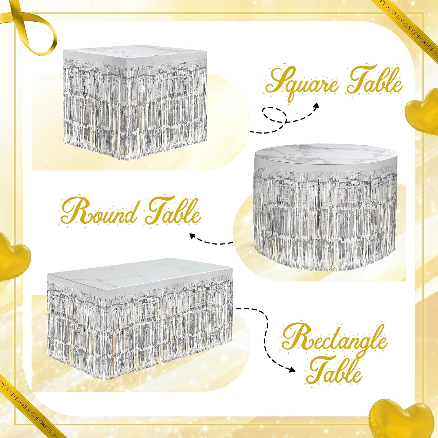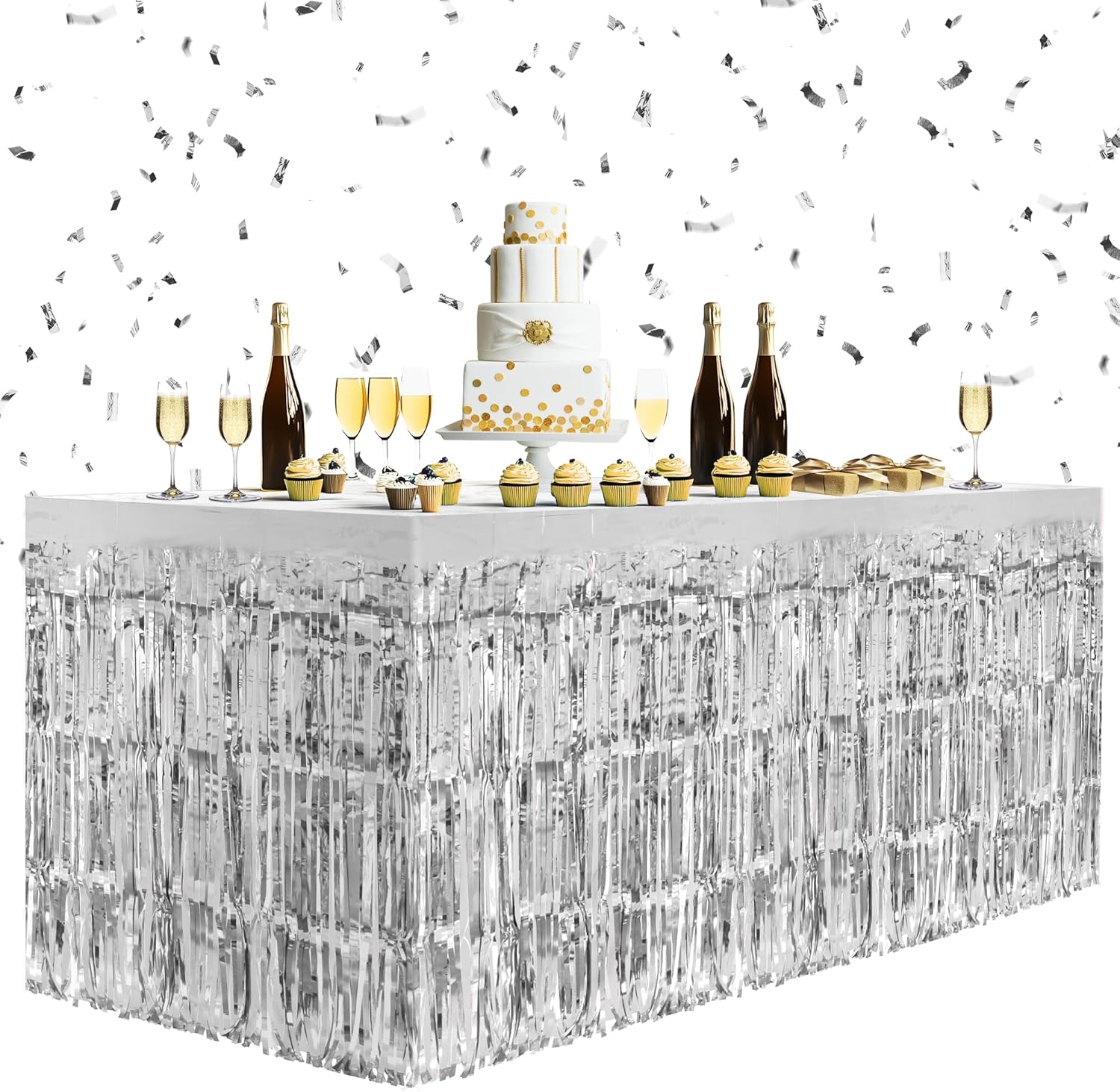 2 Pack Silver Table Skirts, 29x108" Metallic Foil Tinsel Fringe Table Skirts for Rectangle Tables Streamer Curtains Backdrop, Party Decorations for Birthdays Weddings Holidays