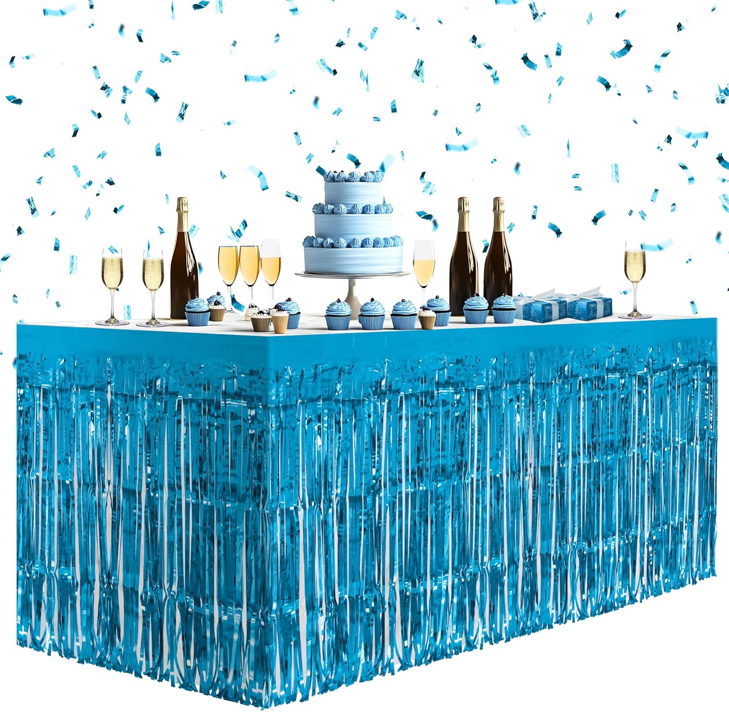 8 Pack Lake Blue Table Skirts, 29x108" Metallic Foil Tinsel Fringe Table Skirts for Rectangle Tables Streamer Curtains Backdrop, Party Decorations for Birthdays Weddings Holidays