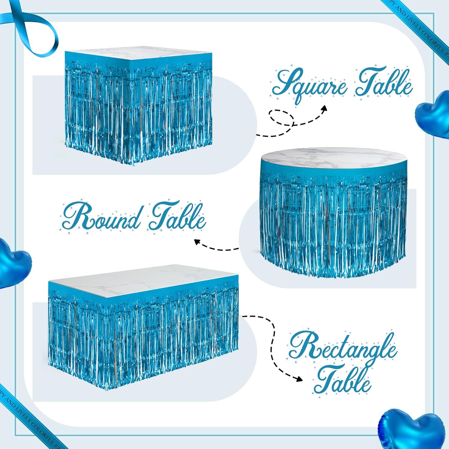 2 Pack Lake Blue Table Skirts, 29x108" Metallic Foil Tinsel Fringe Table Skirts for Rectangle Tables Streamer Curtains Backdrop, Party Decorations for Birthdays Weddings Holidays