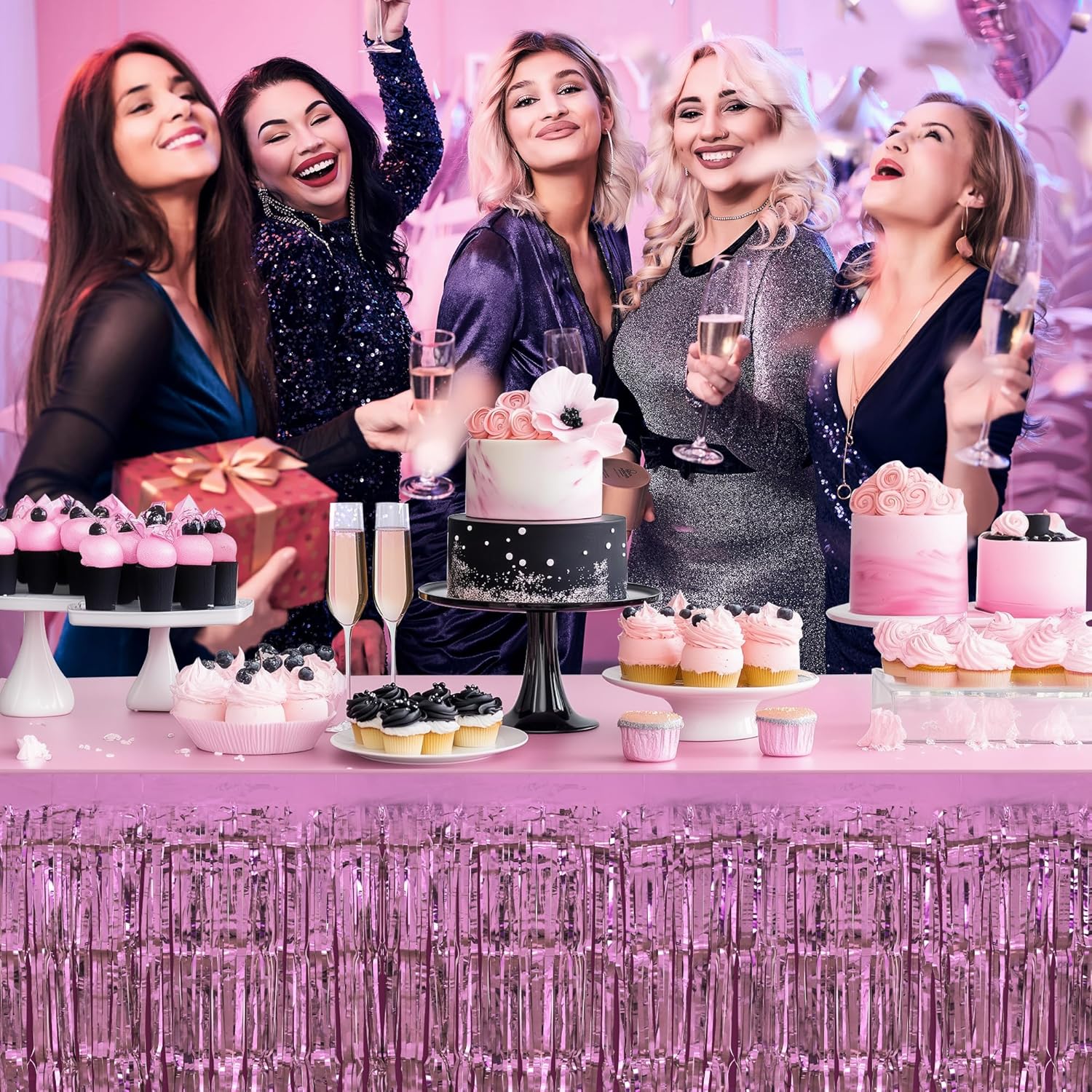 2 Pack Pink Table Skirts, 29x108" Metallic Foil Tinsel Fringe Table Skirts for Rectangle Tables Streamer Curtains Backdrop, Party Decorations for Birthdays Weddings Holidays