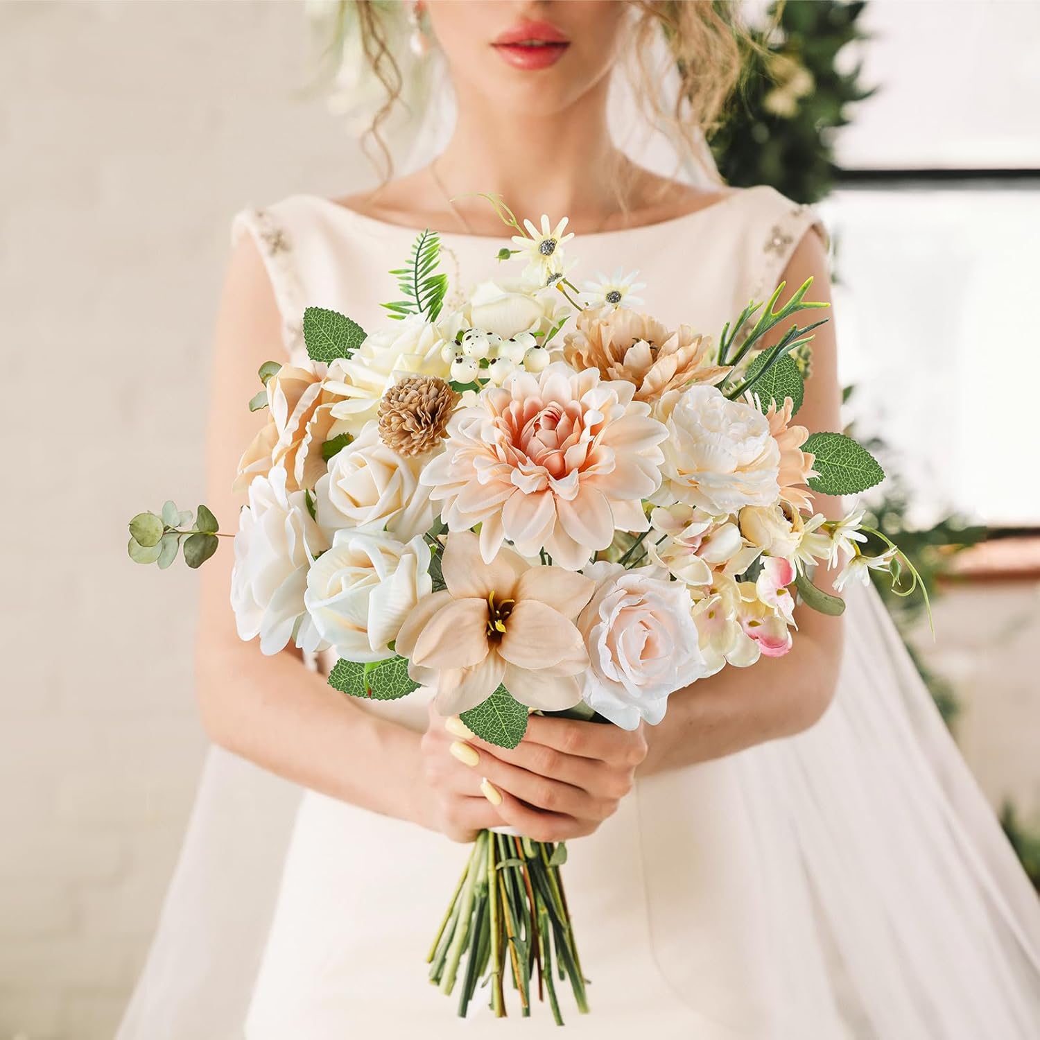- Product Specification:Peonies x 2pcs(assorted size and color);Roses x 12pcs(assorted size and color);Dahlias x 2pcs;Daisies x2pcs;Hydrangea x 1pcs;Other accessories x 18pcs