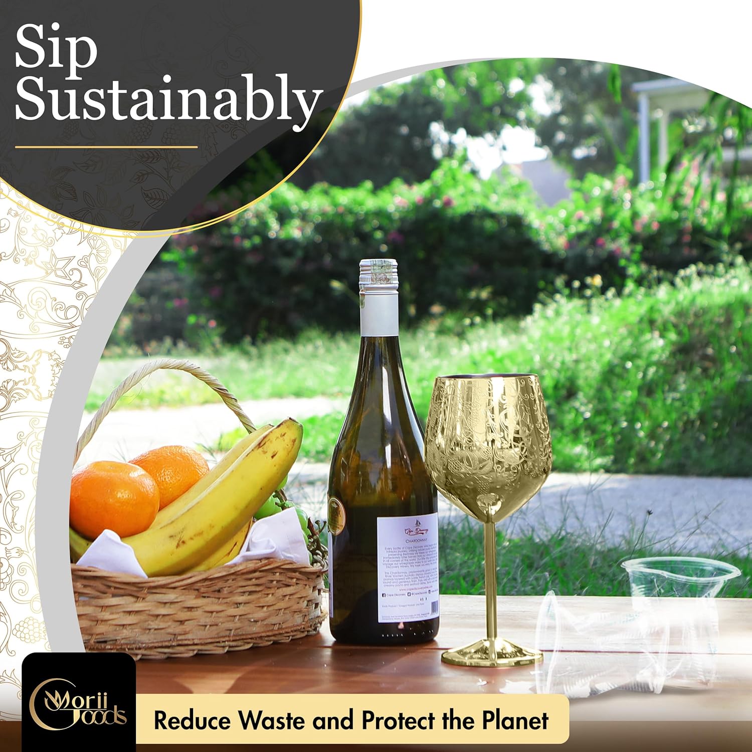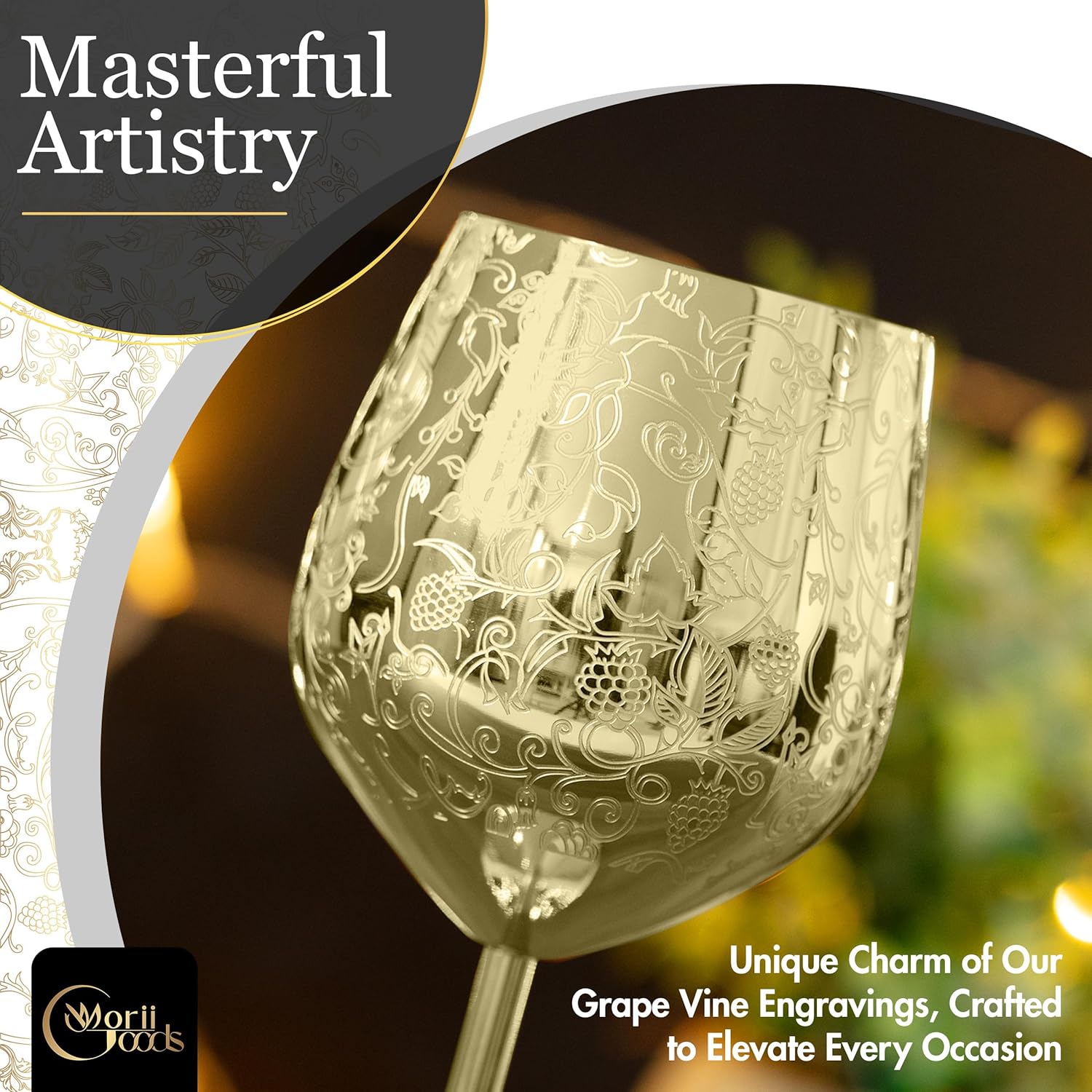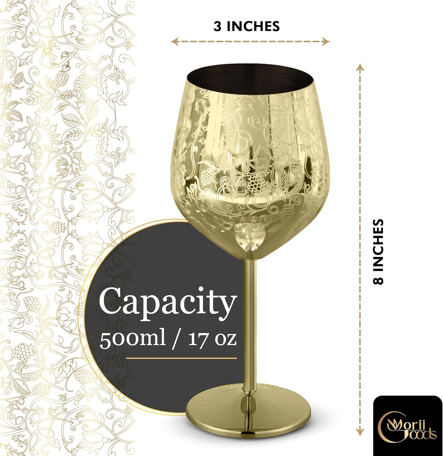 Stainless Steel Wine Glasses - Set of 2 Etched 16 oz Metal Goblets, Unbreakable Gold Cups for Camping, Travel, Outdoor Events, Picnics, Luxury Wine Gifts for Women and Men