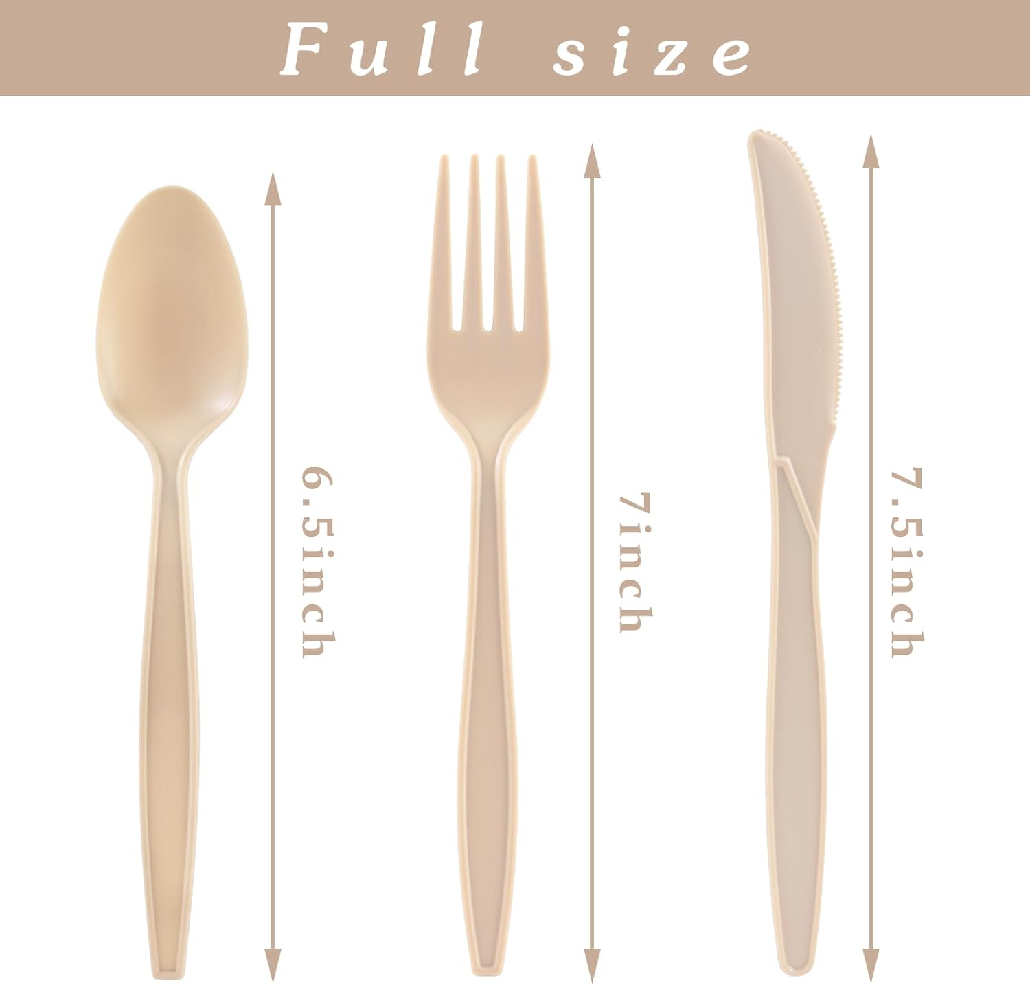 100% Compostable Silverware, Light Brown Plastic Silverware 100 Forks 100 Spoons 100 Knives, Compostable Utensils, No Plastic Utensil, Eco Friendly Disposable Cutlery for Party Office Wedding