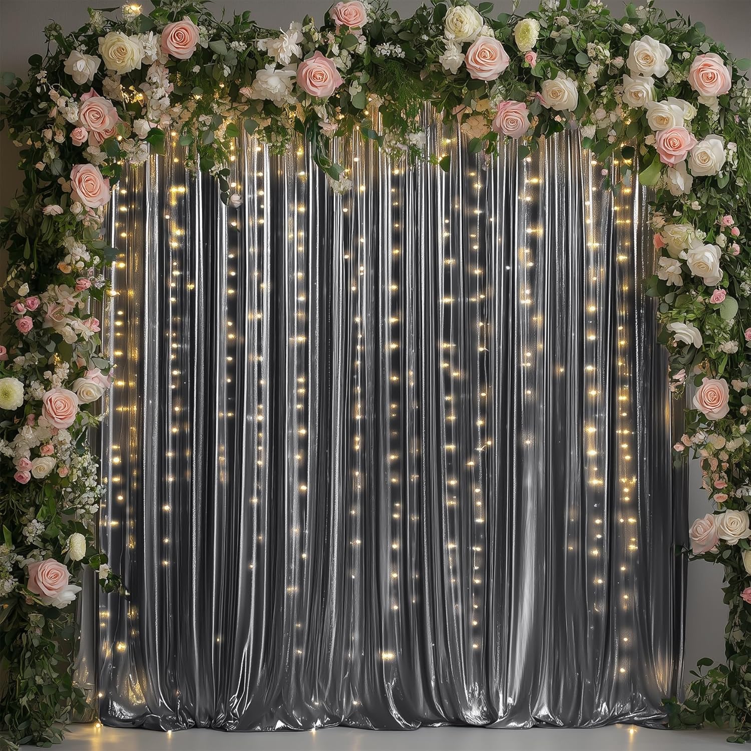 - Easy to Care Black Silver Shimmer Curtains Our 10ft Black Silver sequin glitter party background curtain panels are made of wrinkle-free material, which could be used without ironing. Let you make unforgettable memories for your family or your friends.