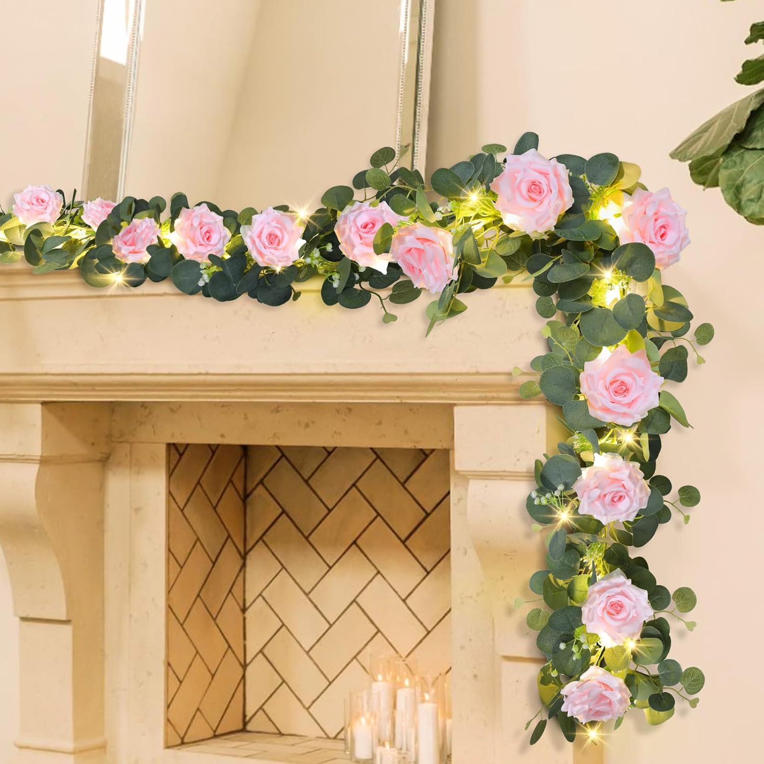 - Eucalyptus Garland with Built-in LED Lights: Transform any space into a magical setting with our 6.6FT eucalyptus garland, now upgraded with built-in led lights! Whether decorating a wedding arch, table centerpiece, fireplace mantel, backdrop, or outdoor garden fence, this rose flower garland brings timeless elegance and a touch of romance to any occasion. The versatile design allows for endless creative possibilities, making it perfect for weddings, Valentines Day, Mothers Day or seasonal celebrations