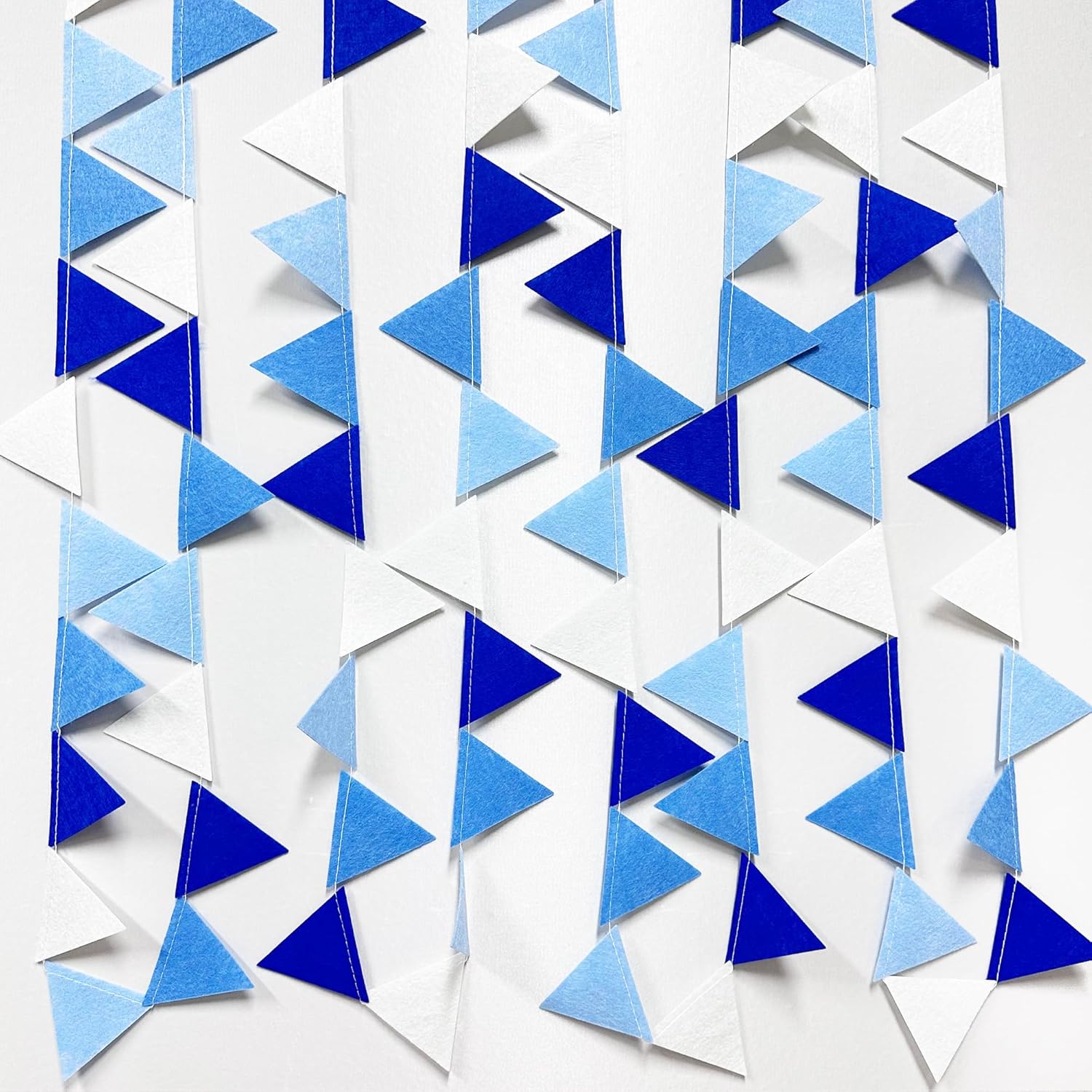 - 🔵Easy Assembly - Easy hanging and reusable.Perfect fit for gradient blue party decor.unroll and unwrap garland carefully. due to delicate nature of thread, may tangle.This blue mini triangle pennant makes an attractive backdrop for videos and photos.