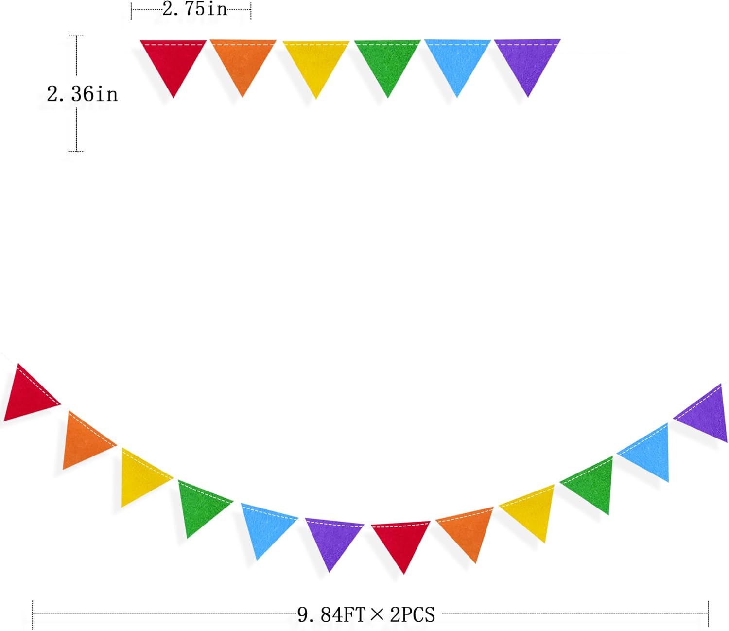 - Package Contains - 2 packs of rainbow mini party bunting banner,Size of each flag is 2.75" × 2.36",Each mini triangle flag is 10 feet long,Total is 20 feet.Meeting daily general needs.
