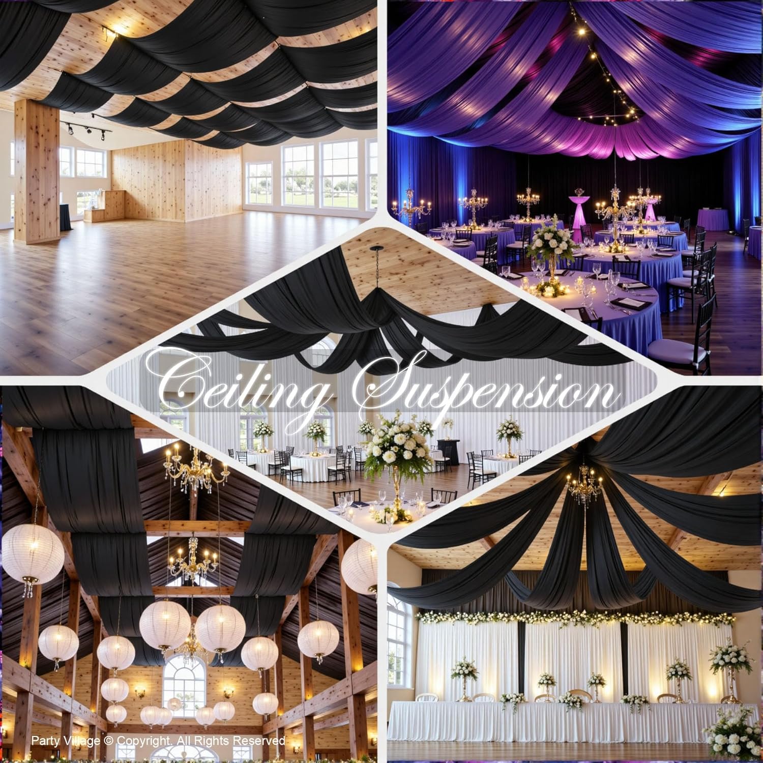 - đăBlack Ceiling DrapesăThe package will include 4 panels Black wedding drape curtain(without hanging pieces), each wedding extra long curtain measures 5 feet (60inch)wide x30 feet(360inch) long.The sufficient quantity can meet your demands for decorating your weddings, parties, receptions, and these Black ceiling drapes will create a delicate and aesthetic sense to your wedding ceiling decoration and light up every banquet.