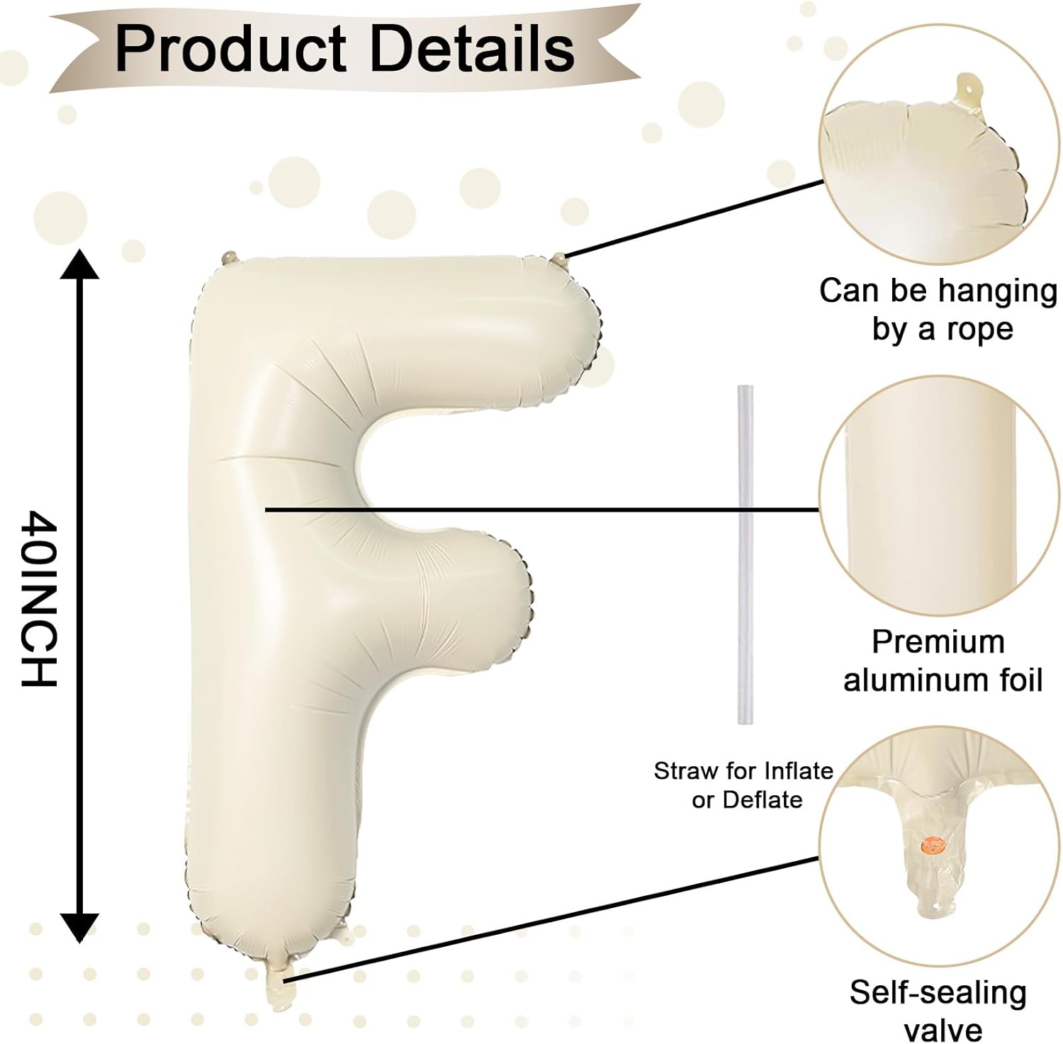 - Cream White Letter F Balloon 40 Inch: Includes 1pc giant beige "F" letter balloon and 1 straw for easy inflation and deflation. Our elegant big beige balloons are perfect for personalized parties. With 26 letters (A-Z) and numbers (1-9) available, you can mix and match to fit your theme.