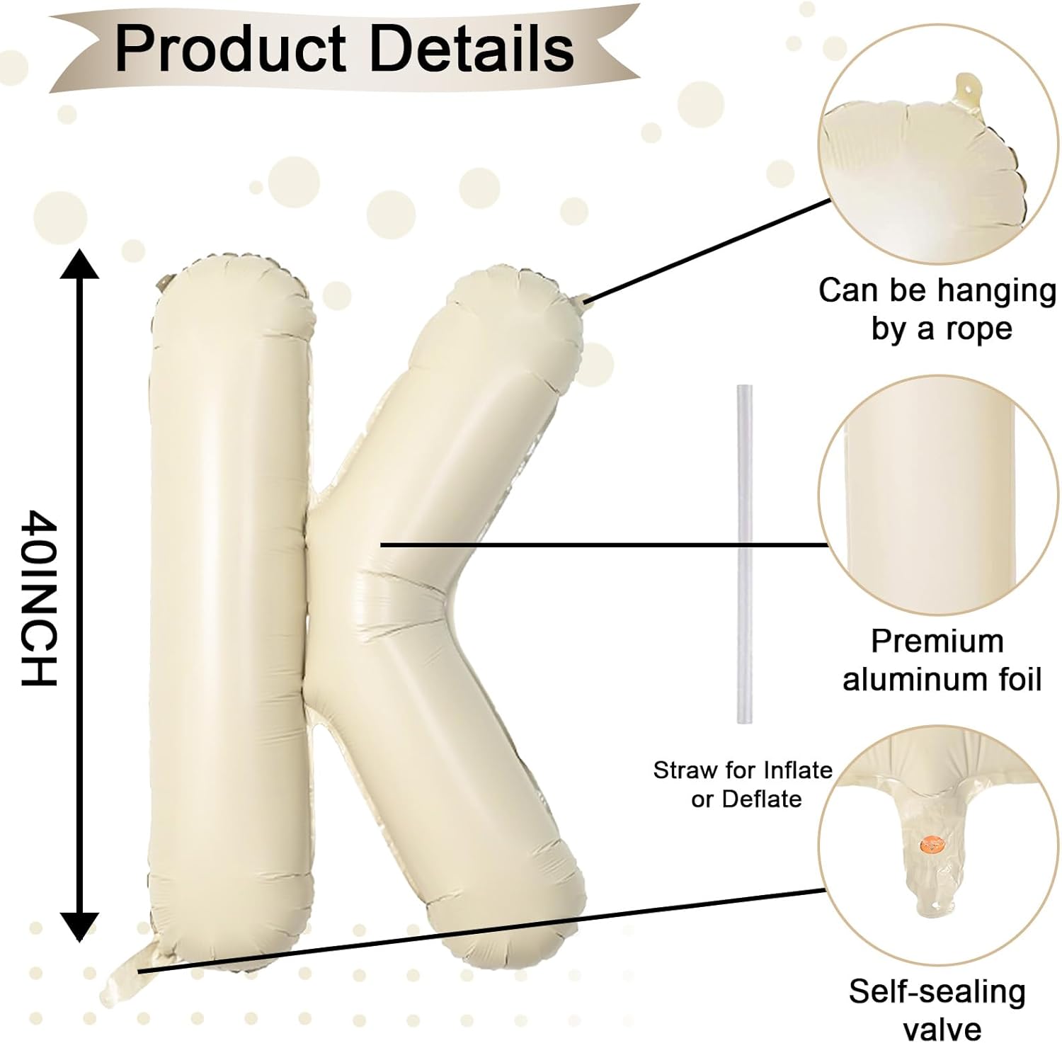 - Cream White Letter K Balloon 40 Inch: Includes 1pc giant beige "K" letter balloon and 1 straw for easy inflation and deflation. Our elegant big beige balloons are perfect for personalized parties. With 26 letters (A-Z) and numbers (1-9) available, you can mix and match to fit your theme.