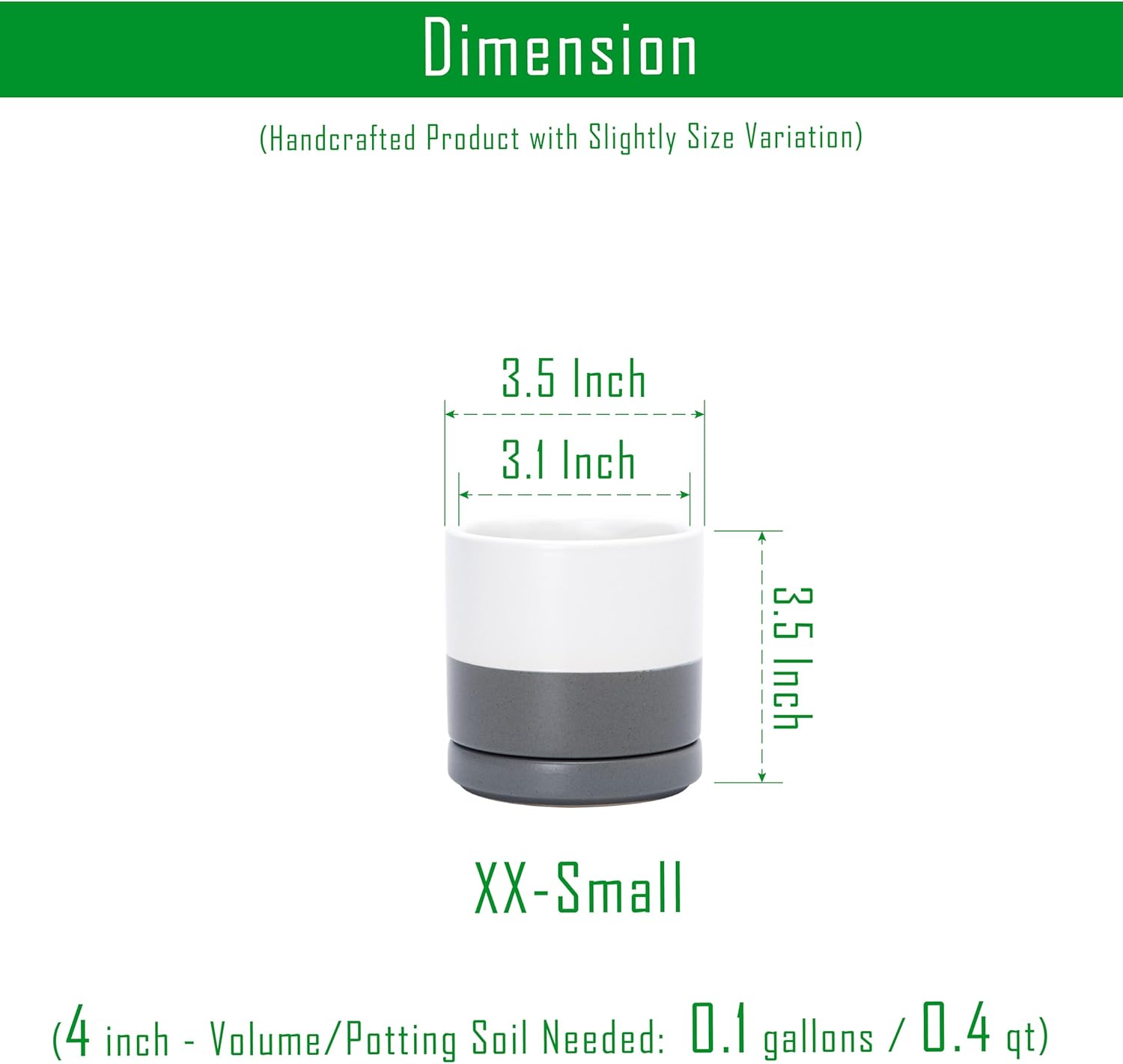 - Set of 4 Small Planter Pots - 3.5" Diameterr (3.1" Inner Diameter) * 3.5" Height. Volume: 0.11 gallons; Potting Soil Needed 0.45 qt.