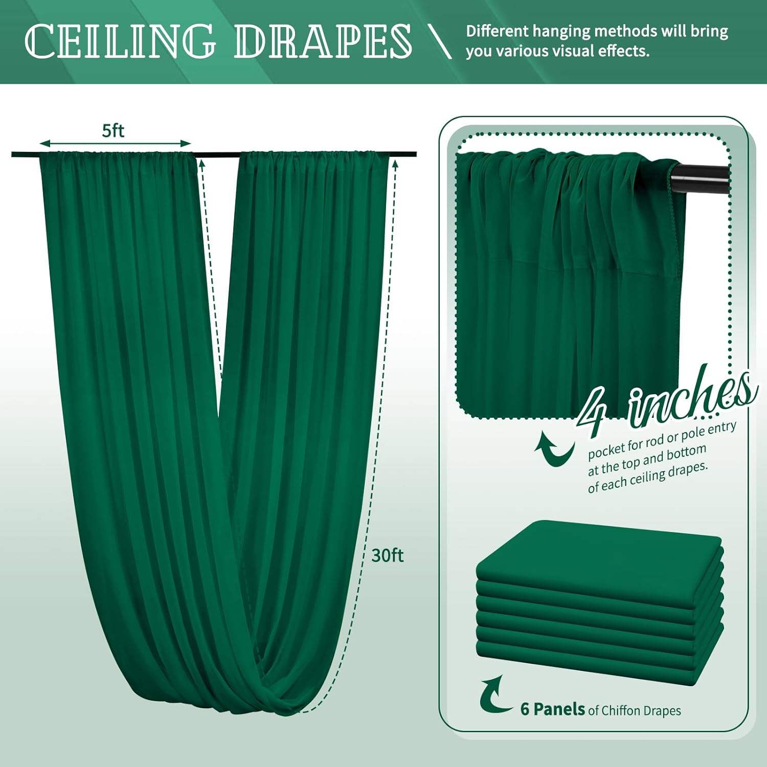 - 【Chiffon Fabric Curtain】The package will include 6 panels emerald green wedding ceiling drapes (Not include stand !!!), each wedding extra long curtain measures 5 feet(60inch)wide x30 feet(360inch) long. Sufficient quantity can meet your needs. These arch draping are applicable for any indoor and outdoor occasion either for decorative or functional uses.