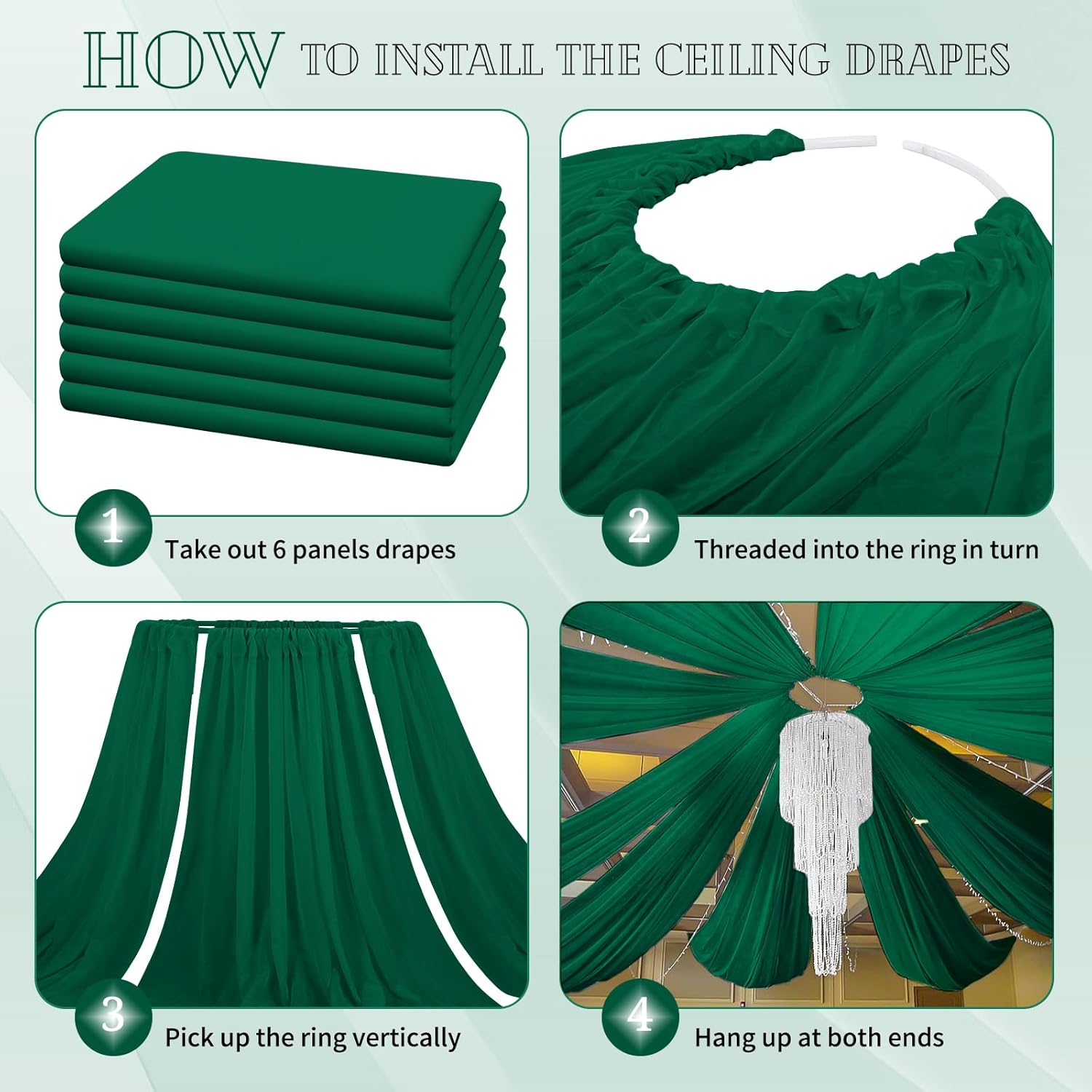- 【Emerald Green Ceiling Curtain Easy to Install】There is a 4 inches pocket for rod or pole entry at the top and bottom of each panel creating beautiful draping. Entry at the top and bottom of each panel creating beautiful and natural draping. Sheer arch draping fabric are good choice to decorate your party and event. Different hanging methods will bring you various visual effects.