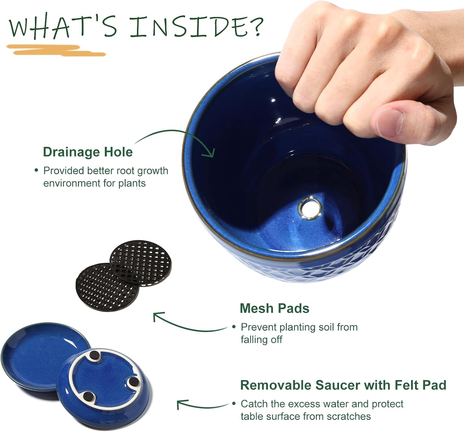 - Removable Saucers with Feet Pad: These planters comes with feet pad on the bottom of saucers and can be placed anywhere you want without worrying about scratching the countertop. The smooth texture makes them clean easily. Just add a small plants or flowers and you have a new showpiece