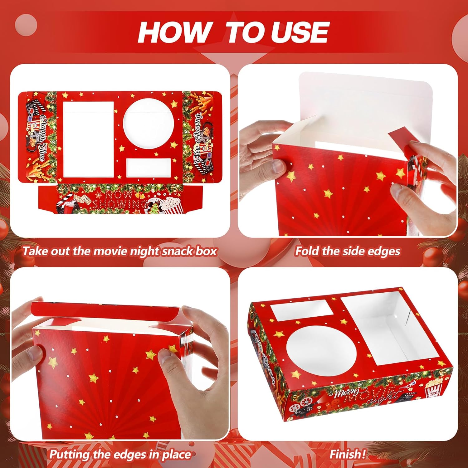 - Detailed Size to Apply: movie theater snack boxes are measured about 20 x 15 cm/ 8 x 6 inches, which has the right size to hold in your hand, and can be folded up, providing you with a convenient food carrier when you are watching a movie