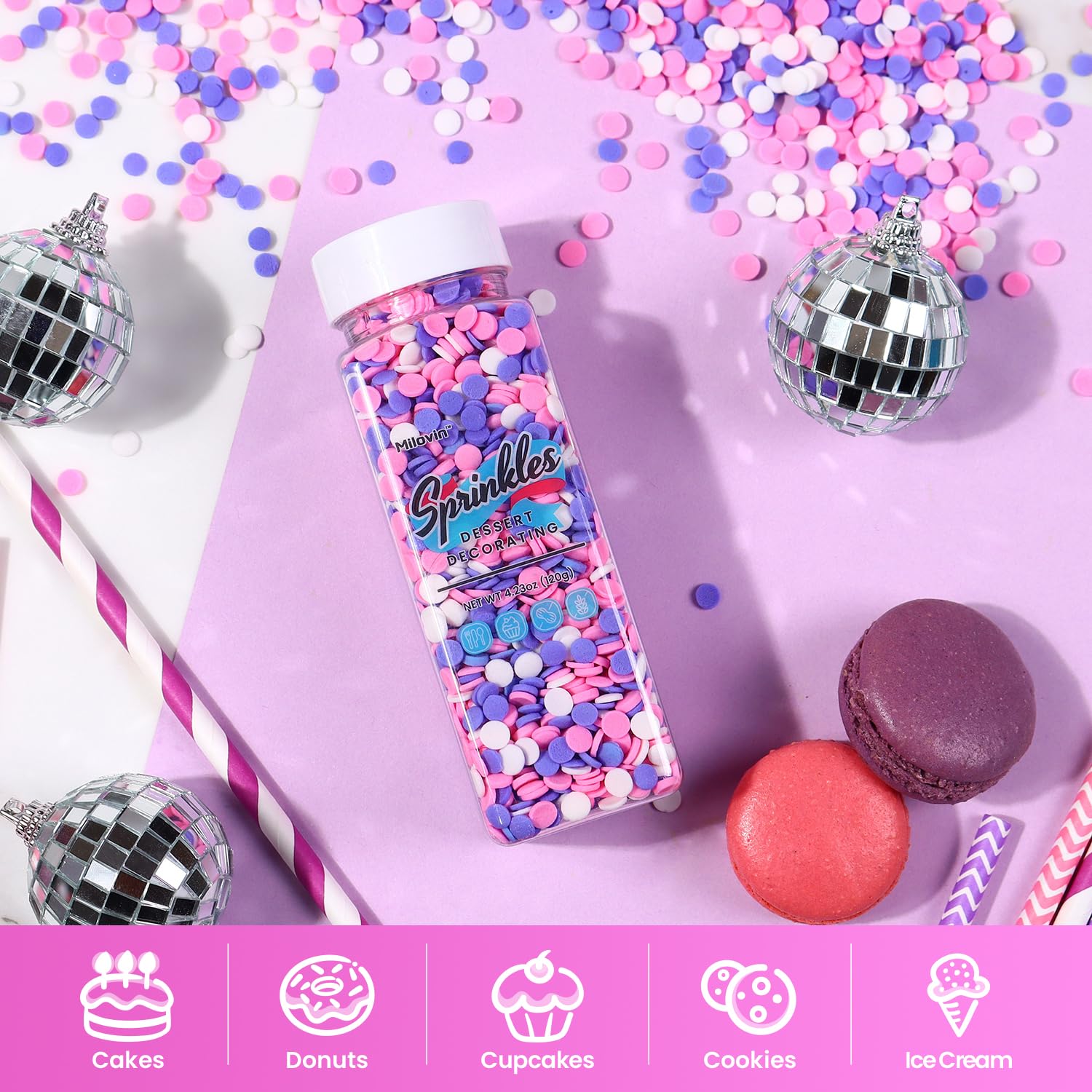 - Confetti Sprinkles for Cake Decorating: A bottle of edible purple, pink and white round sprinkles, whether it's cakes, cupcakes, cookies, ice cream, cake pops, brownies, or any dessert you can dream of; our sprinkles are your go-to for that extra dash of cheer