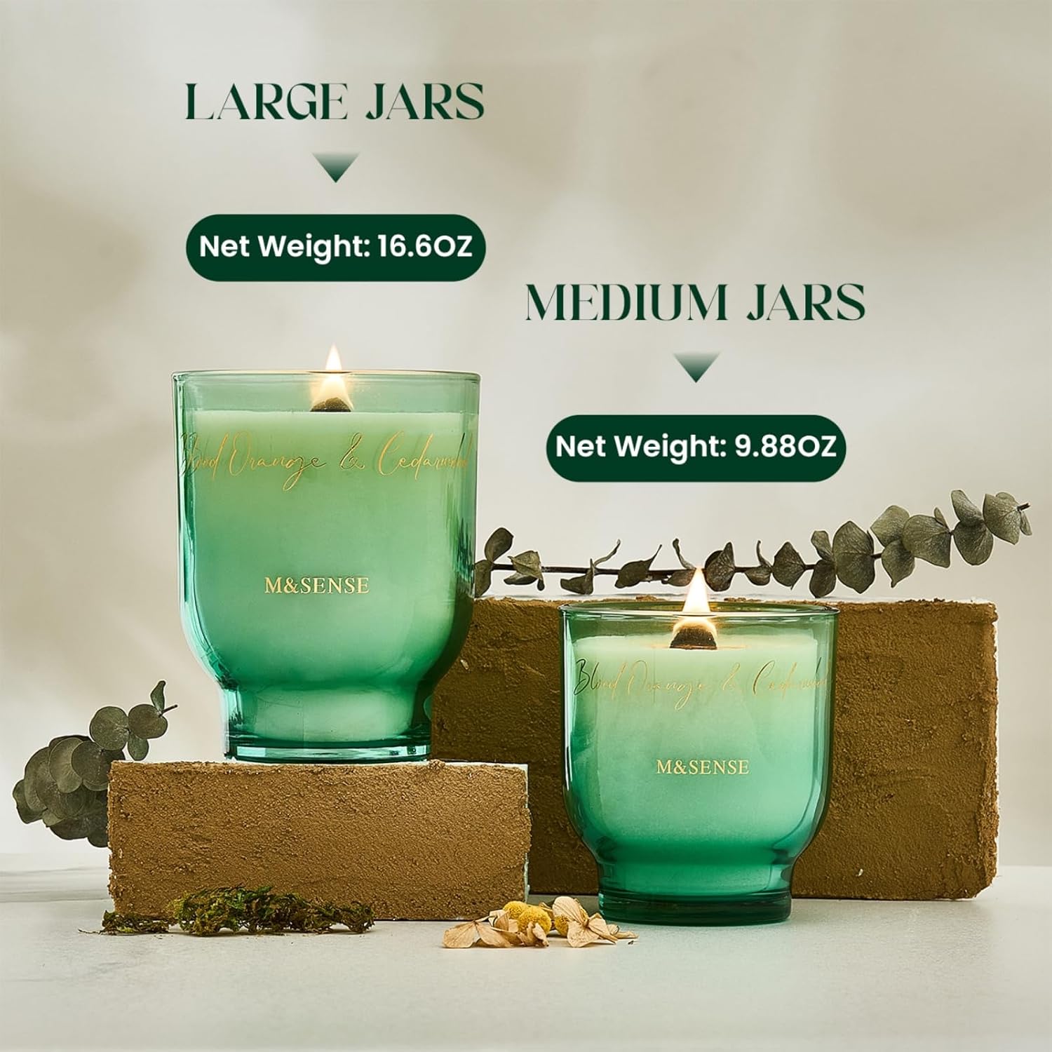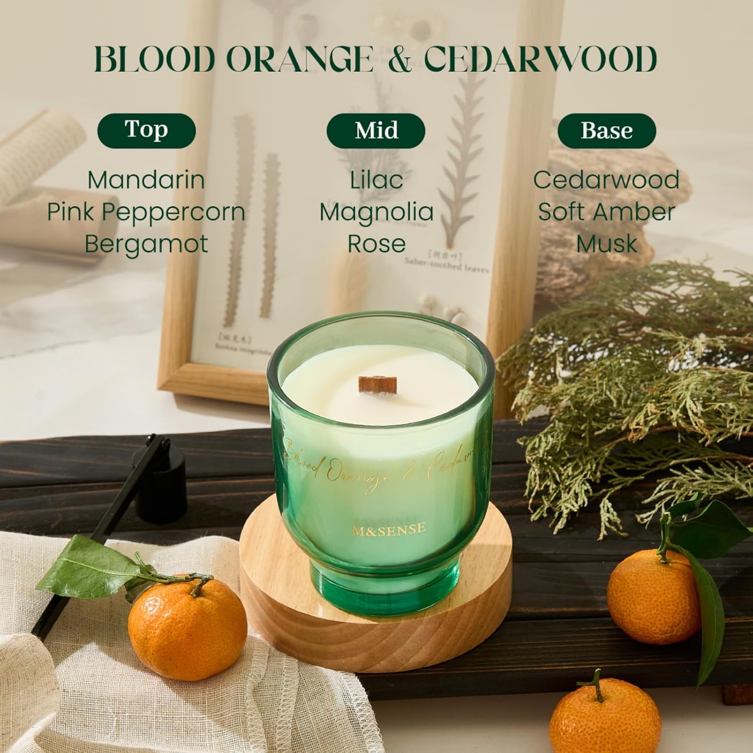 M&SENSE 9.88oz Natural Soy Wax Jar Candle with Wooden Wick | Blood Orange & Cedarwood Scent | 55-Hour Burn & Long-Lasting Burn | Housewarming Gift for Men and Women