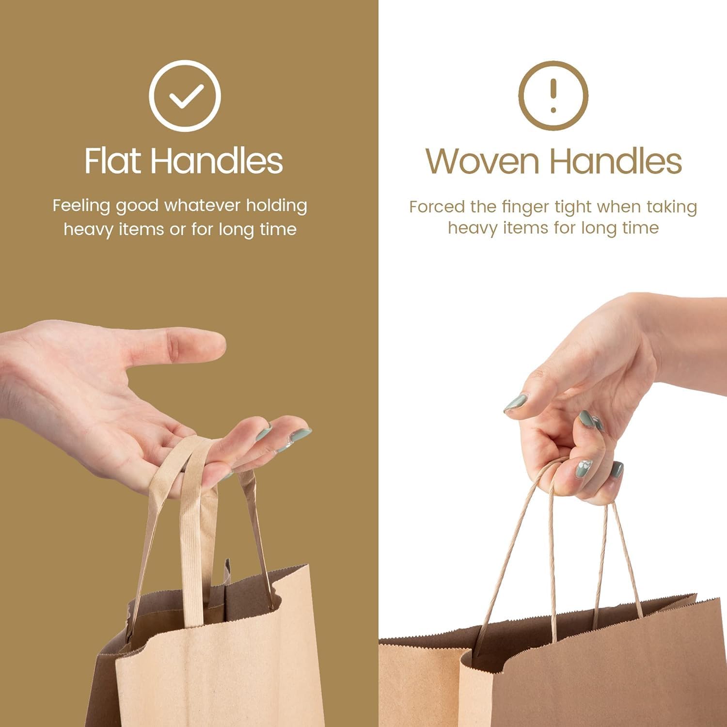 - GSSUSA Brown Bags with Flat handles - Size 10"X5"X13", a pack of 200 goodies bags, simple and smooth design, with a strong flat handle, giving a high-end feeling, and easy to carry. Suitable for various forms of small Gifts or commodities.