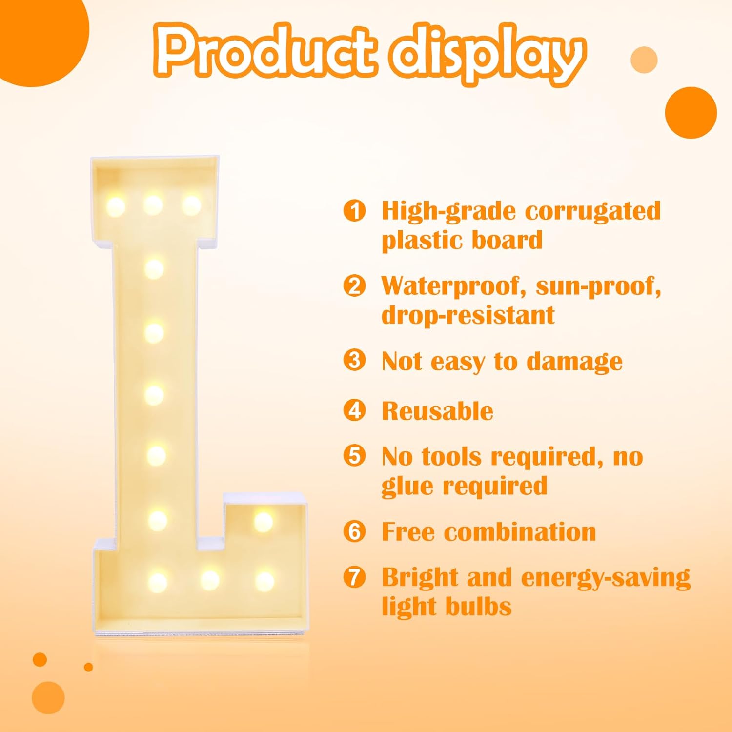 - Easy To Assemble Light Up Letters: Our unique 4ft marquee light up letters are not afraid of water and is not easily damaged. Pre-cut boards with clear markings help you set up your marquee light up letters with minimal effort, and quickly without any tool. The combination of letter balloons and fake flowers will make the decoration full of vitality, romance, and joy, adding a sense of celebration to the party. Letter L