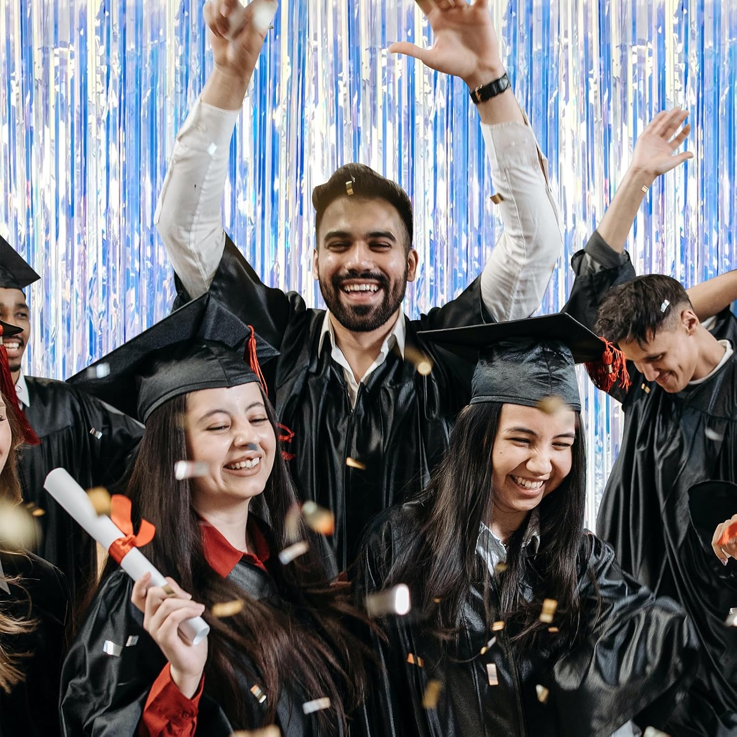 - Party Streamers Backdrop: 5Packs/Set, each pack curtains size is 3.28 ft x 6.56 ft, enough length foil fringe backdrops are perfect for the door or wall to create an impressive decoration for parties, events, and photo booths. Create your own party decorations now!