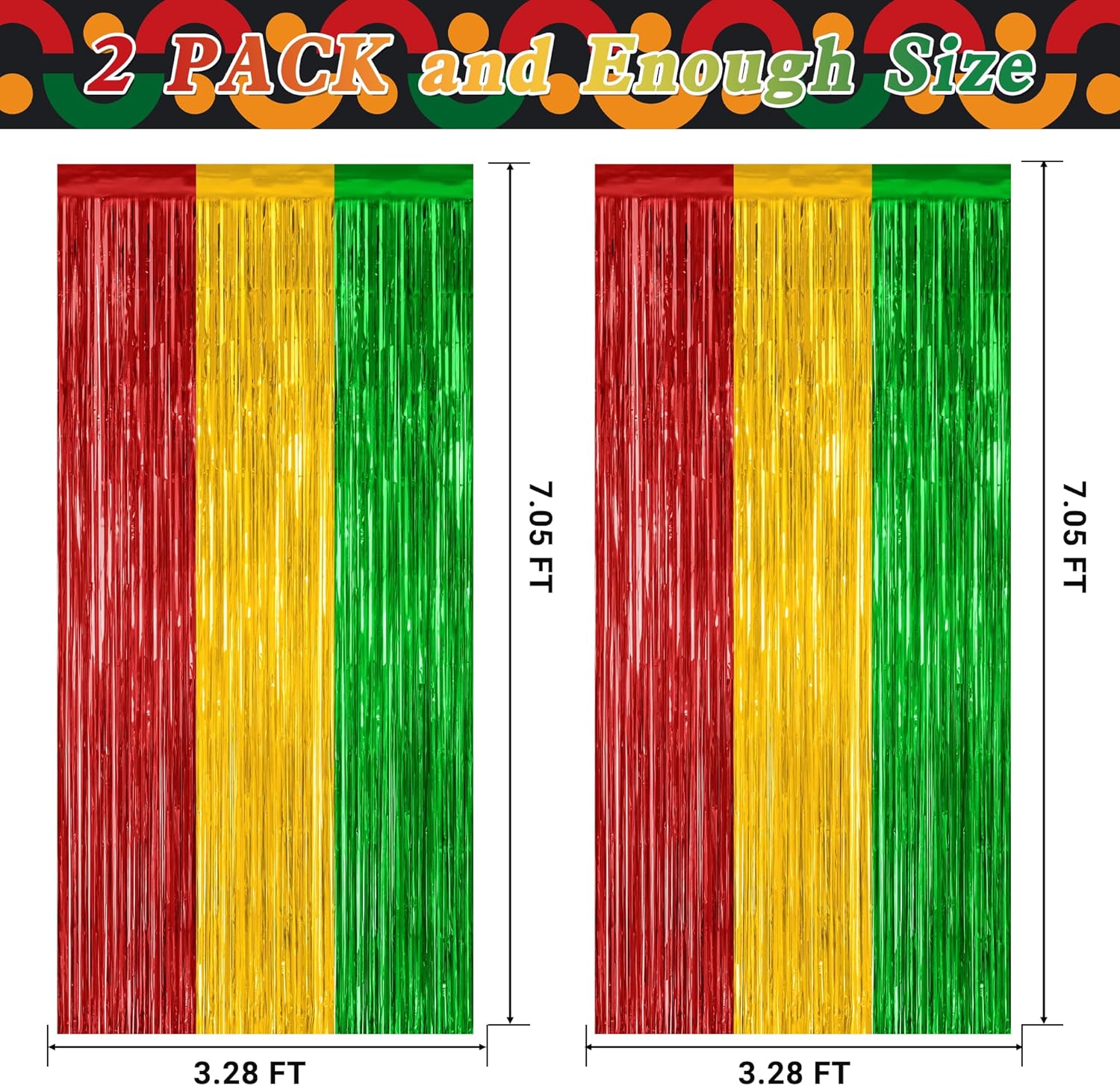 - Package Includes: This package contains 2 pcs foil curtains, each measuring 3.28 ft x 7.05 ft, consisting of vibrant red, yellow and green colors.