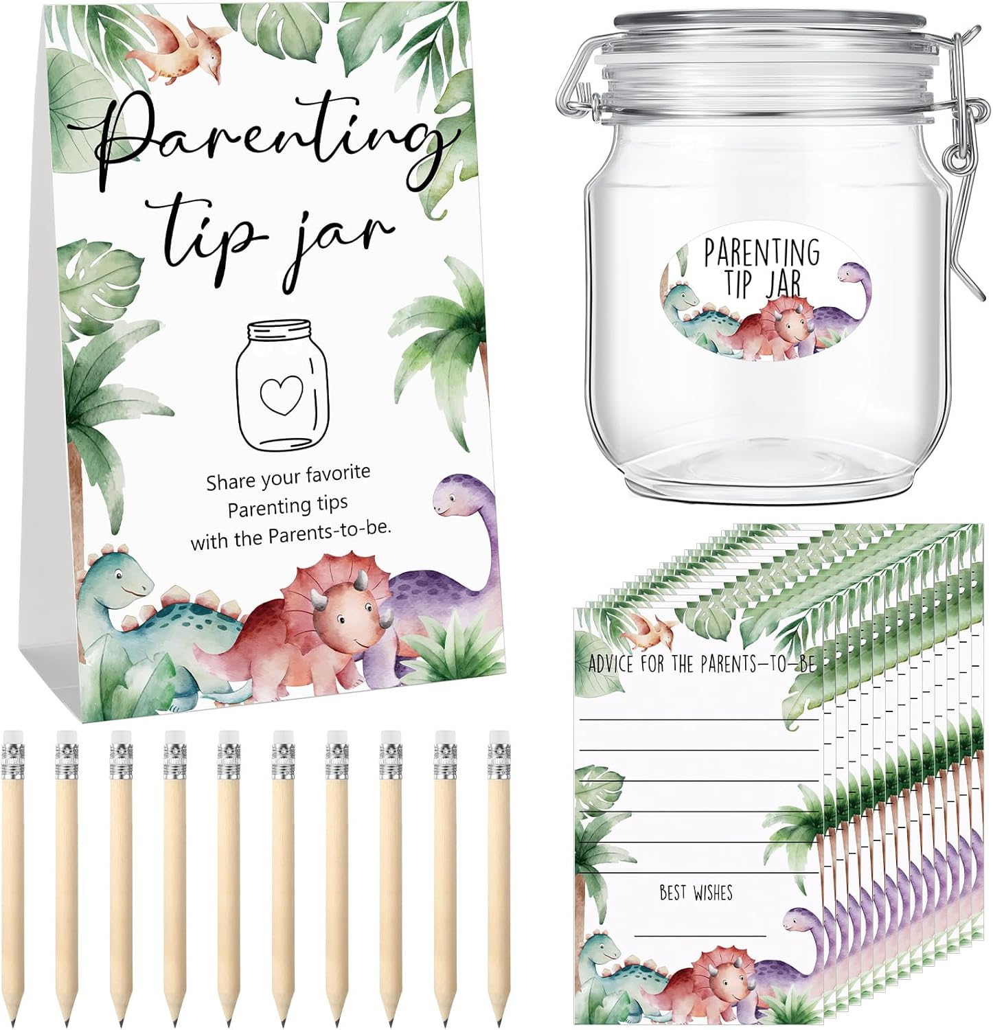 Roowest Baby Shower to Baby Advice Cards for New Parents to Be - Tip Jar Sign for New Parents 60 Parenting Advice Cards 10 HB Pencils 2 Cute Stickers 1 Pet Bottle for Guests Games(Dinosaur)