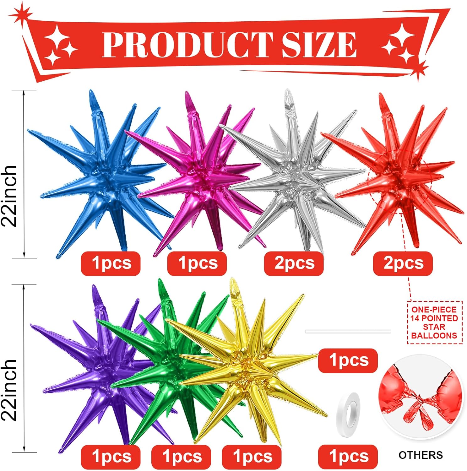 - Colorful Star Balloons Set:Package include 9pcs 22Inch explosion star balloons(silver x 2,red x 2,gold x 1,hot pink x 1,dark blue x 1,green x 1,purple x 1).Large enough to help you better decorate your party.