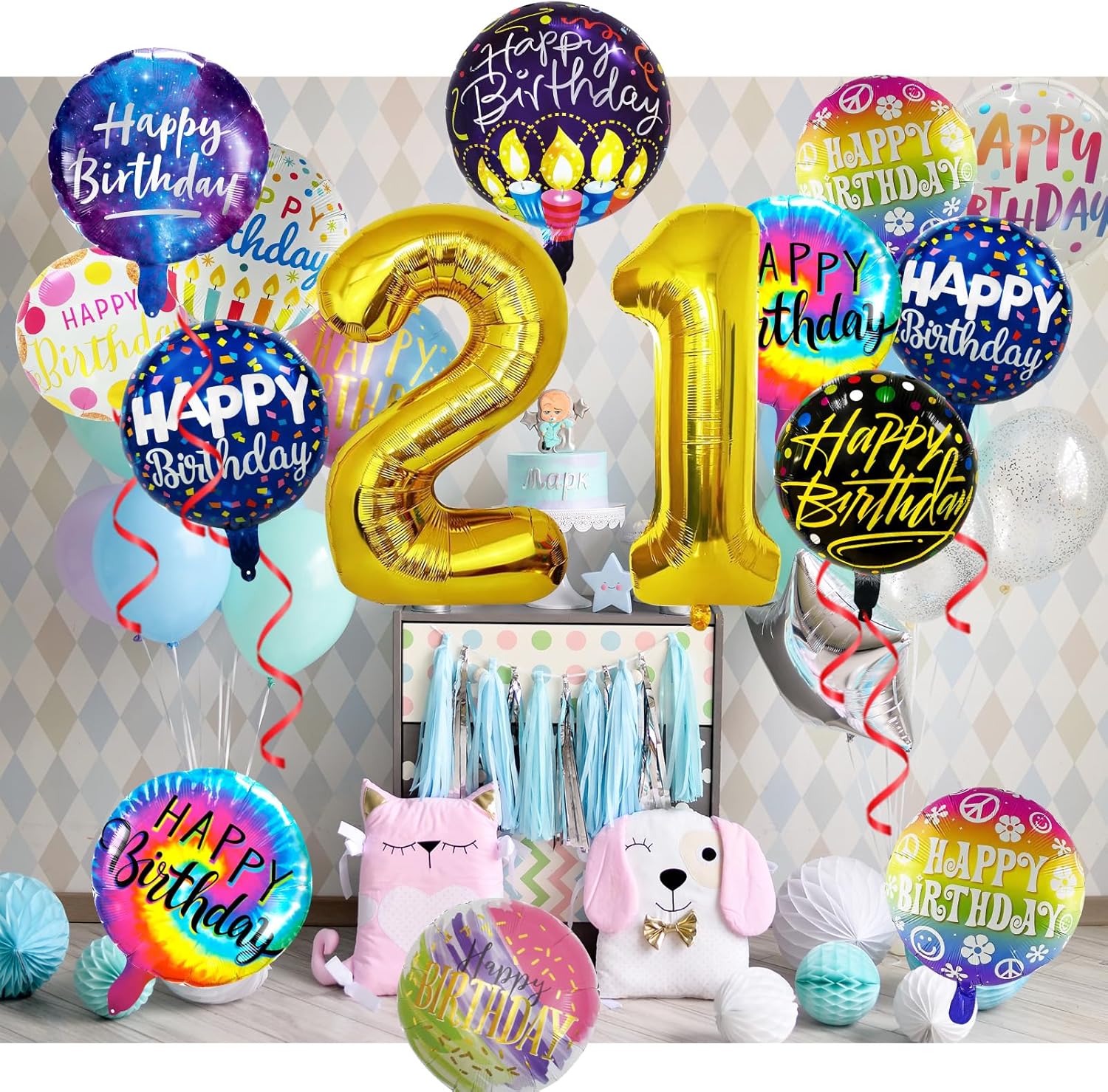 50 Pcs Happy Birthday Party Aluminum Foil Balloons and 21th Birthday Balloons, 18 Inch Round Aluminum Foil Balloon with" Happy Birthday" Sign, Birthday Party Decorations for Boys/Girls (Yellow, 21)
