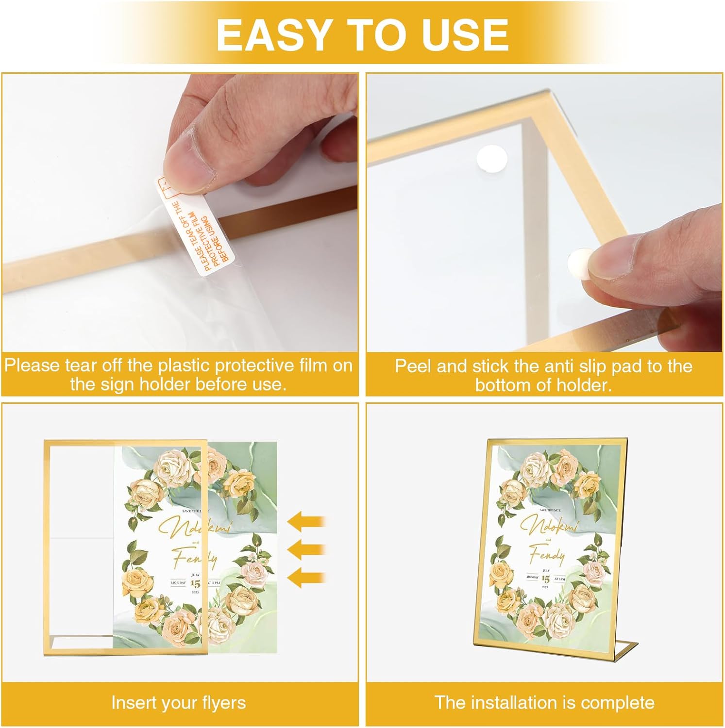 - Easy to Use: Insert 4 anti-slip pads into the base, Each of our Acrylic Sign Holder comes with a peel off film guide, follow the red arrows to peel off the film in seconds, and the plastic sign holder has an opening on its side for easy paper insertion