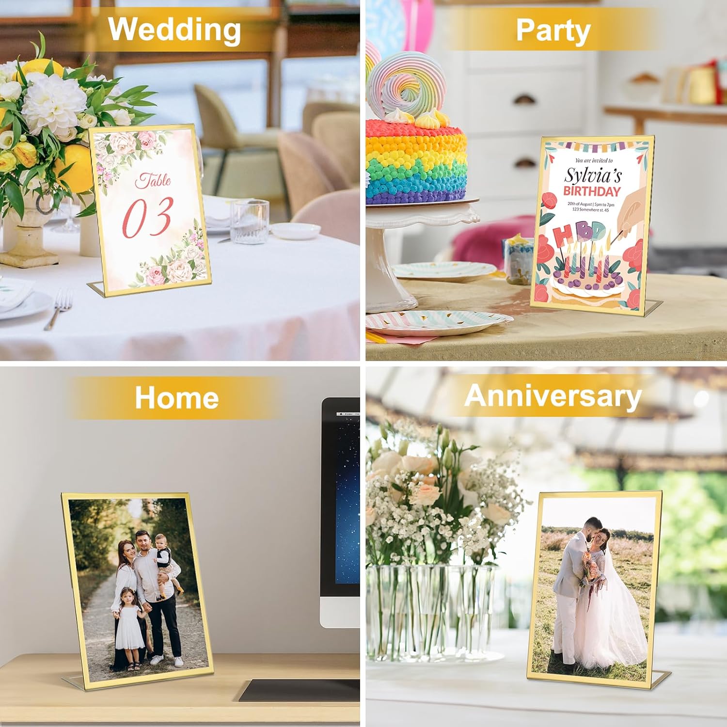- Wide Range of Application: EHWINE Premium acrylic gold photo Frame is suitable for displaying photos, pictures, brochures, menus, artwork, advertisements, etc. on wedding tables, offices, stores, schools and anywhere else